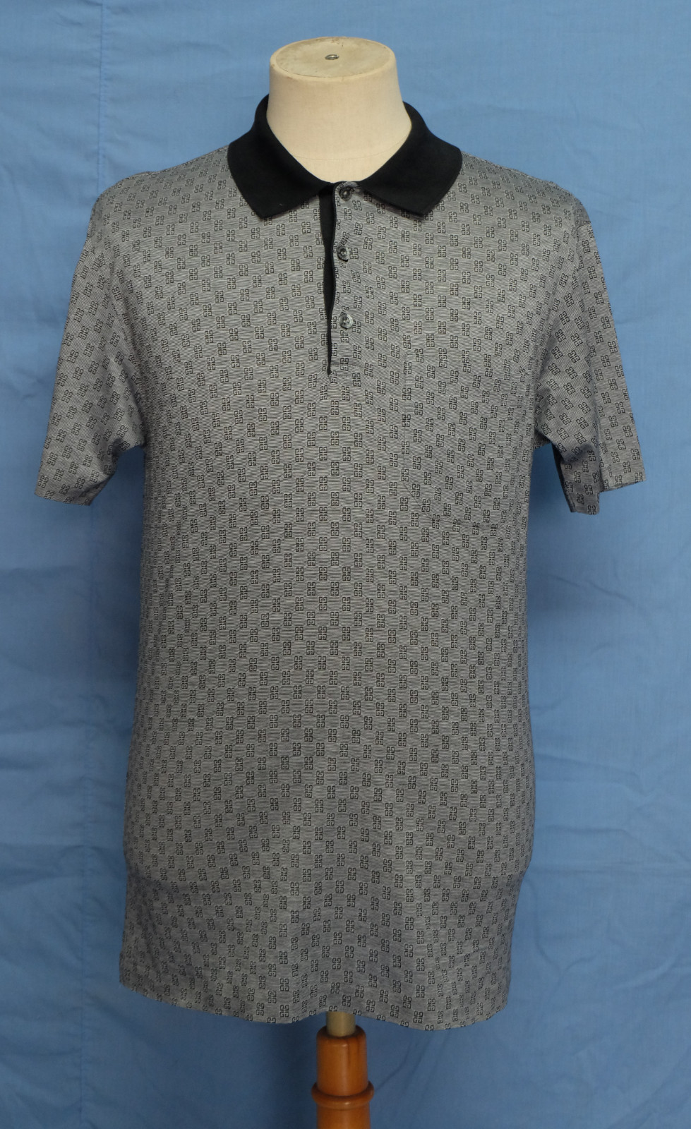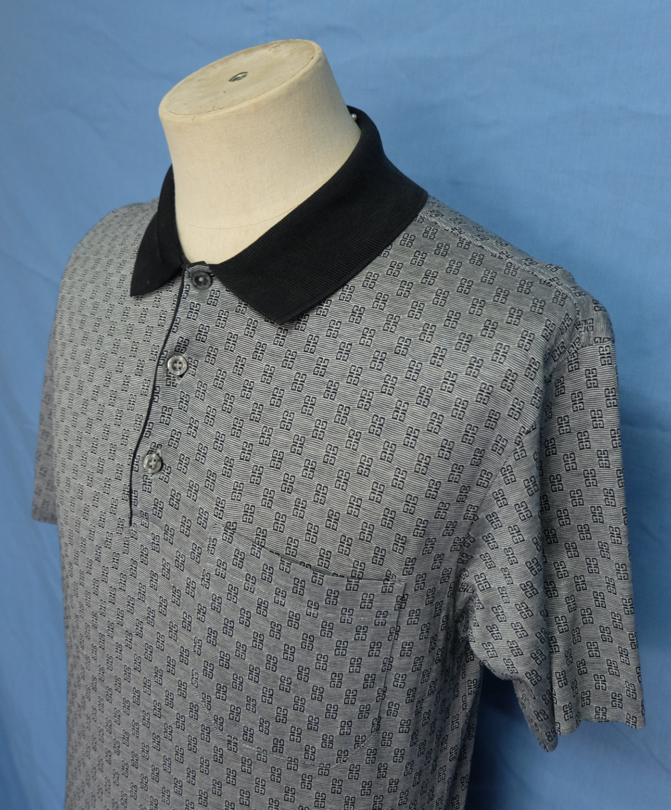 Awesome vintage 80's GIVENCHY mercerized cotton made in Italy men's polo shirt authenticity guaranteed. Check out awesome uséd designer polo shirt. The shirt is awesome with woven fabric GG logo and embroidered on pocket. The color is black, gray with stripe and GG, 3 emboss mother of pearl buttons closure on front. Fabric is 100% mercerized cotton. The shirt is pre-owned still in good condition, There is a stain on the end of right sleeve. It has been laundered clean and fresh ready to wear. Don't miss out cool and awesome designer polo shirt.