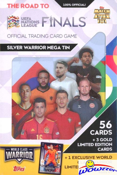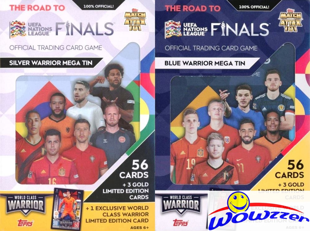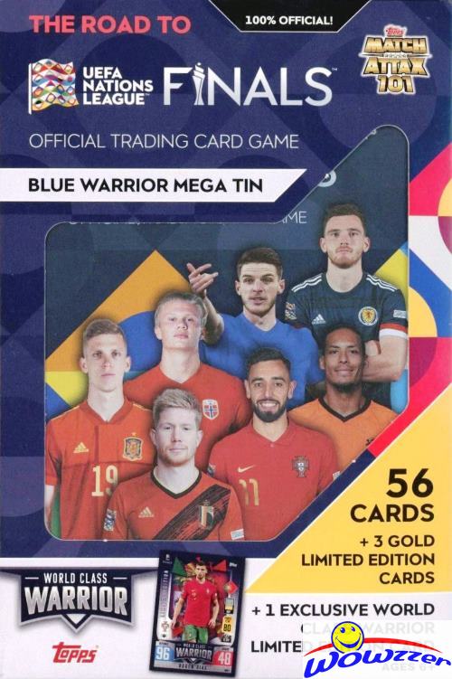 Wowzzer! We are Proud to offer this 2022 Topps Match Attax Soccer Road to UEFA Nations League Finals Factory Sealed MEGA TIN 2 Piece Complete Set! This Set Includes One of the SILVER WARRIOR Mega Tin and one of the BLUE WARRIOR Mega Tin! Each Factory Sealed MEGA Tin includes 56 Cards PLUS 3 GOLD Limited Edition Cards and One EXCLUSIVE World Class Limited Edition Card!  ***Total of 120 Cards in this MEGA TIN Set Including (8) LIMITED EDITION Cards! 2022-23 Topps Road to Nations League Finals Match Attax Soccer - This incredible ALL-NEW Road to UEFA Nations League Finals set features all the biggest superstars in international European football as well as the breakthrough talents of the future. The stunning new card design is complimented with an abundance of special insert cards as well as RARE and ULTRA-RARE surprises, making Match Attax 101 the ultimate international football collection for 2022. Look for Topps Index Rankings, NEW Parallel Series, NEW Limited Editions, RARE Chrome Chase cards, ULTRA-RARE World Class Autographs and much, much more! Also Look for Green, Purple and Crystal Parallels! This Product is Loaded! Good Luck with your Pulls!
