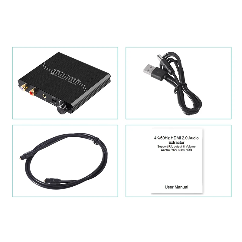 This audio extractor can be connected between the source device (DVD player, Blu-ray player, network player, set-top box, PS2, PS3, Xbox360, PC, etc.) and the display device (TV, HD monitor, projector), It can synchronously separate one optical fiber signal and one R/L signal connect stereo channel to the sound system to obtain high-quality audio signals. Support audio formats such as AC-3, DTS, LPCM.The product is also designed with a volume knob, which can flexibly control the output analog volume.