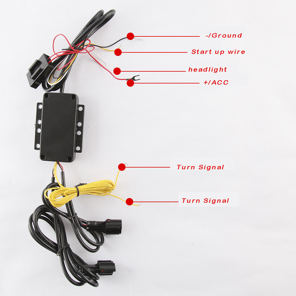 - Wiring Setup Tap the module box's red wire to ACC 12V+ or parking light +, and black wire to ground Tap the module box's blue and grey wires to the left and right turn signal light + to turn off the xenon white LED lights when turn signal light is in use Tap the red/black wires of the LED daytime lamp to the turn signal light's positive and negative to enable the turn signal light function