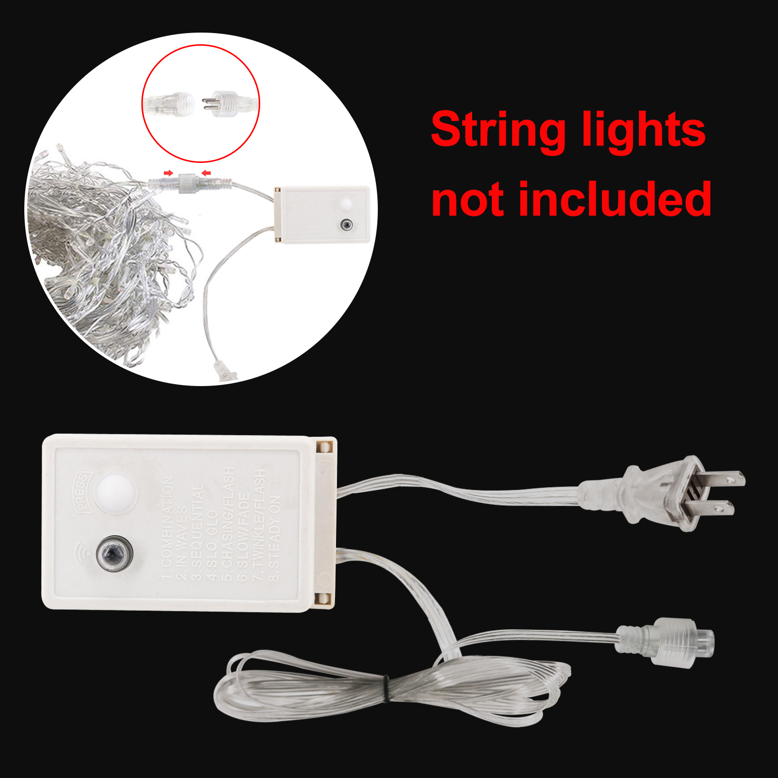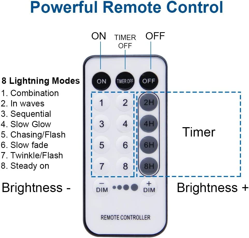 -The controller has 8 different lighting modes:combination, in waves, sequential, Slo-Glo, chasing/flash, slow fade, twinkle/flash, and steady on, and you can control the light modes by the controller.