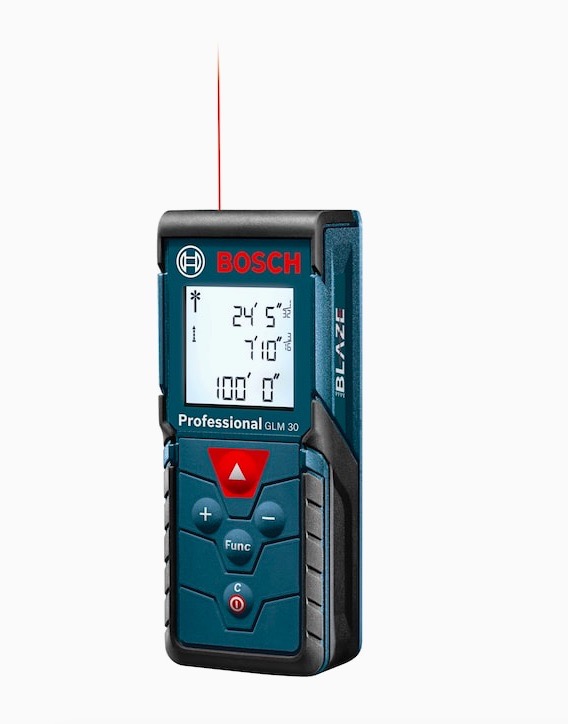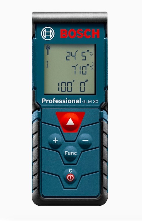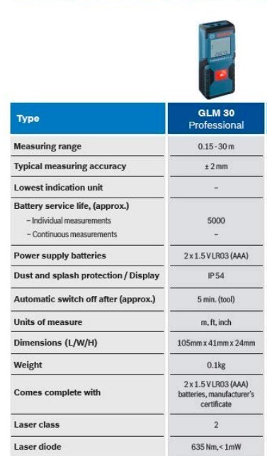 Professional distance measurements made simple – the handy Laser Measure GLM 30 Professional's one-button interface makes measuring easy and intuitive. It can be carried conveniently in a pocket thanks to its compact design for quick distance measurements whenever necessary. The tool also features a time-saving AutoSum function that automatically adds up measurements and presents the results on its illuminated display for review. Equipment & Application This laser measure is suitable for single-length indoor measurements for electrical installations, HVAC, and carpentry. It can also be used for material calculation for tilers and painters. Additional Information In addition to its built-in dust and splash water protection, the Laser Measure GLM 30 Professional also features a sturdy, shockproof housing that protects the tool from damage when dropped from a height of up to 1 metre.