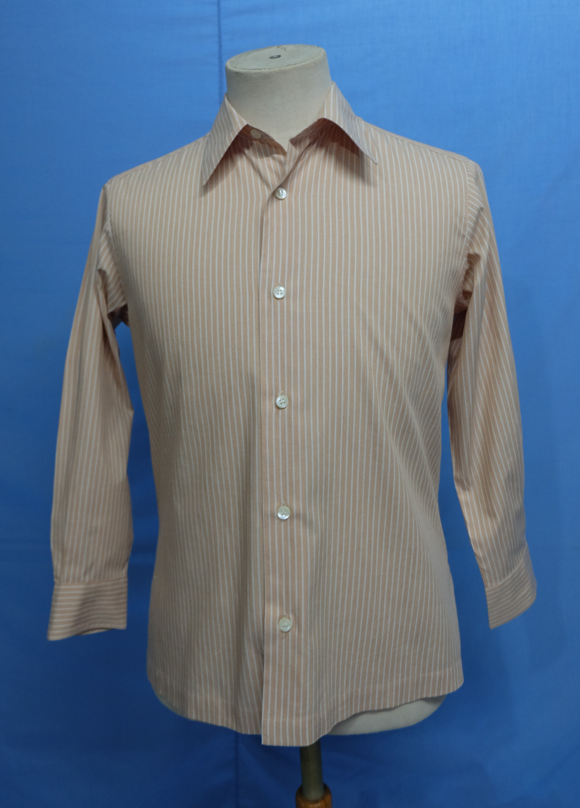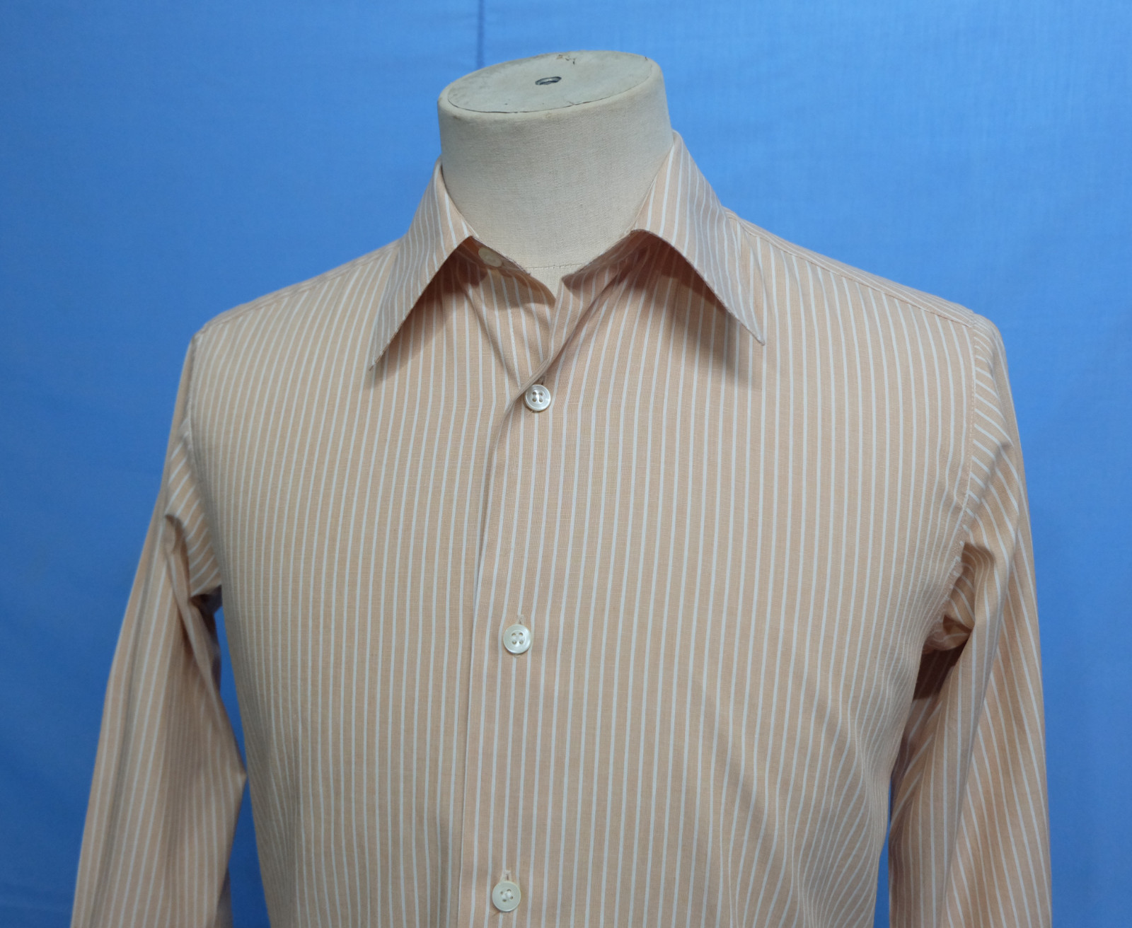 Awesome ISSEY MIYAKE im product white & peach striped men's casual shirt long sleeves with buttons front authenticity guaranteed. The shirt is pre-owned still in good condition, there is a hole near the last button. Please see the photos. It has been laundered clean and fresh ready to wear. The shirt has point collar with 6 mother of pearl buttons closure on front. The color is white, peach with striped pattern. Fabric is 100% cotton. Don't miss out cool and awesome shirt.