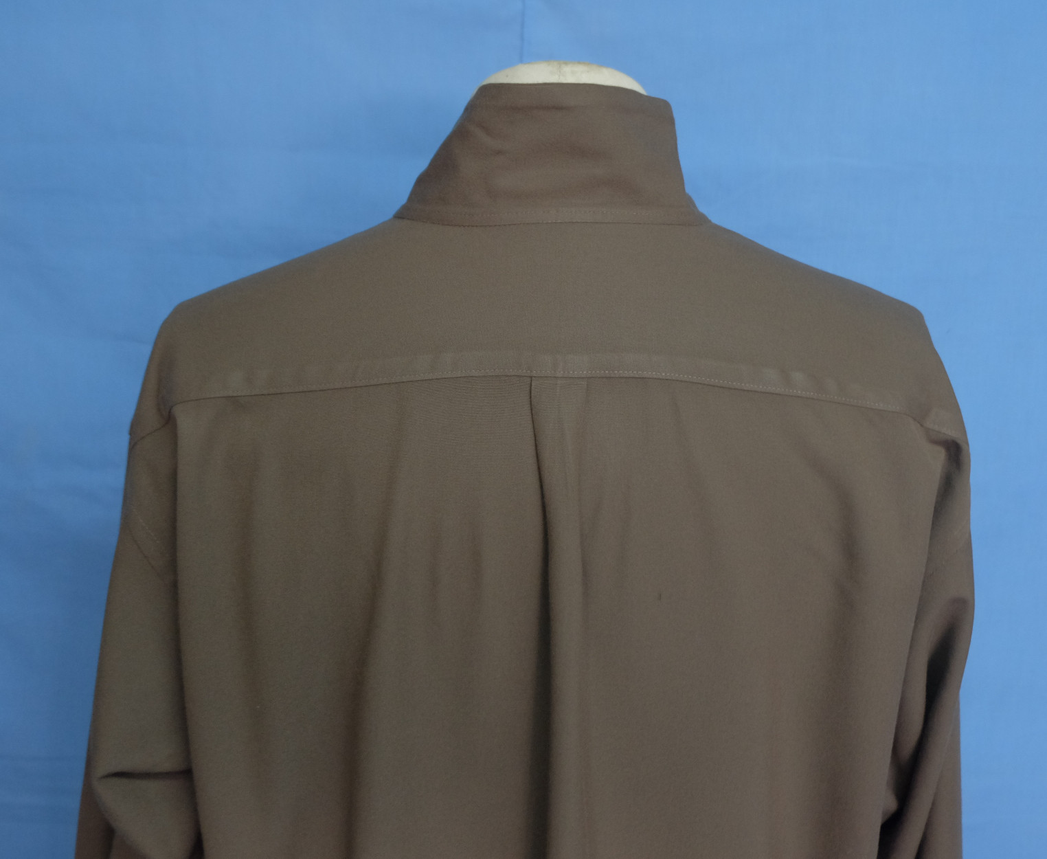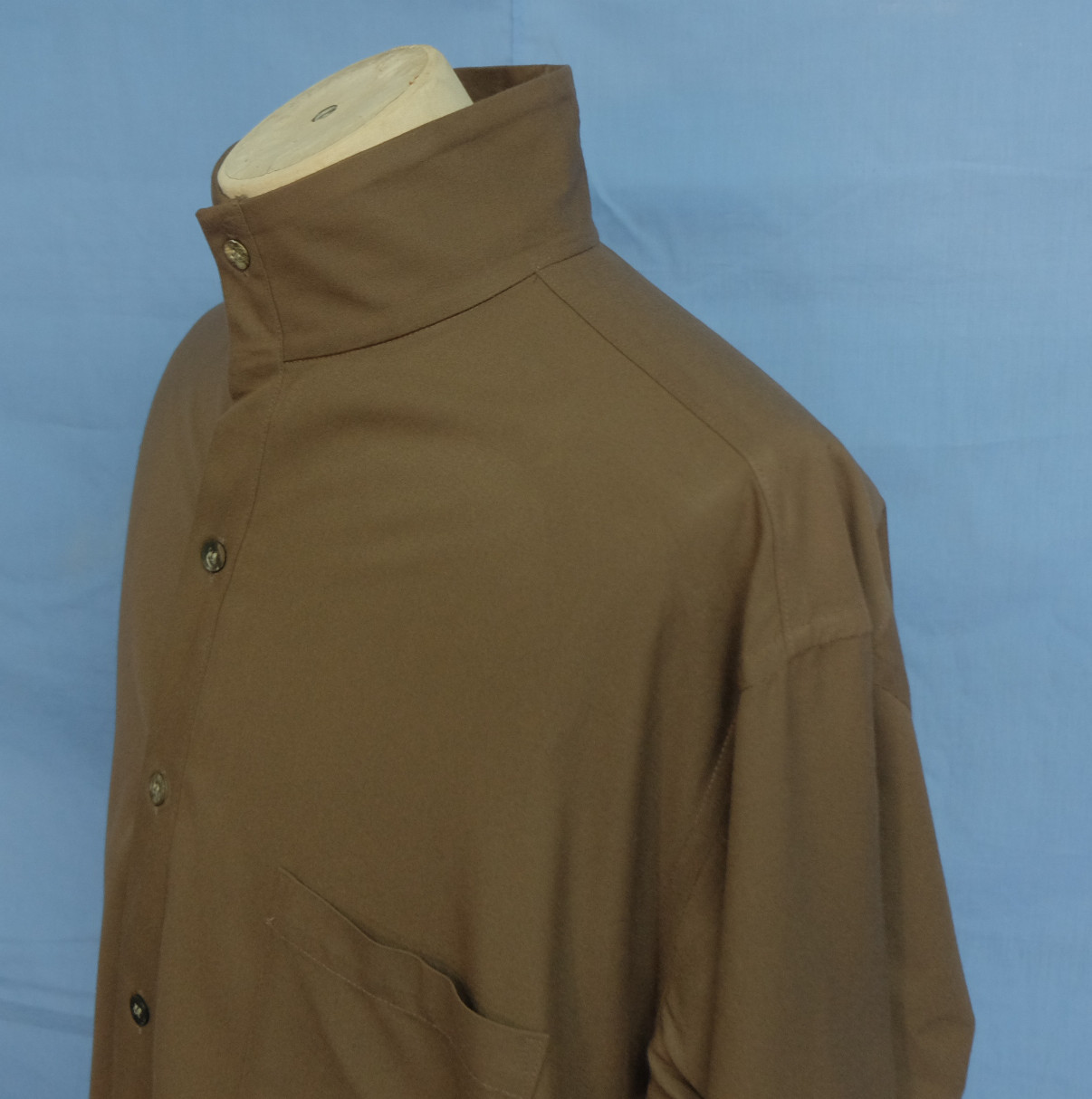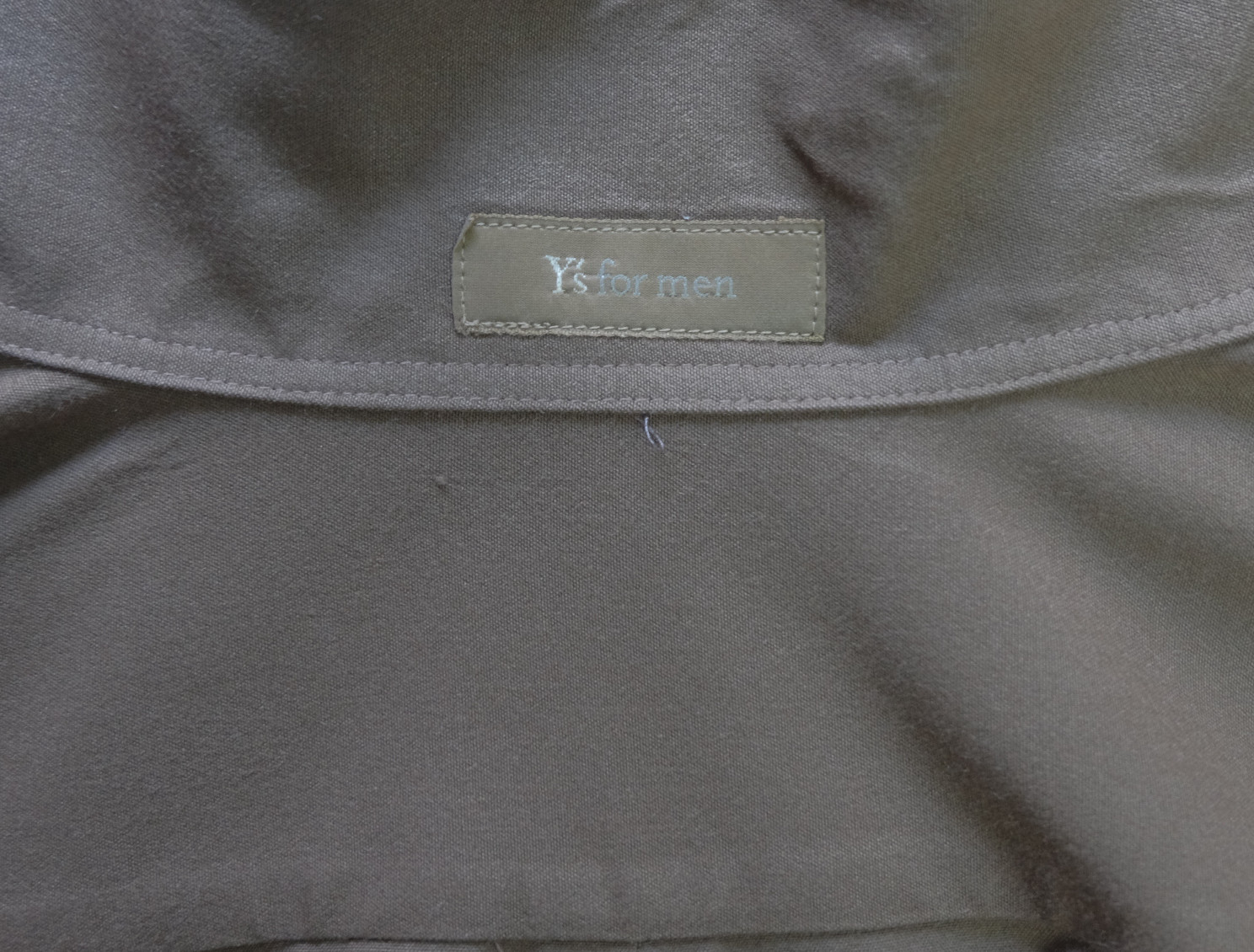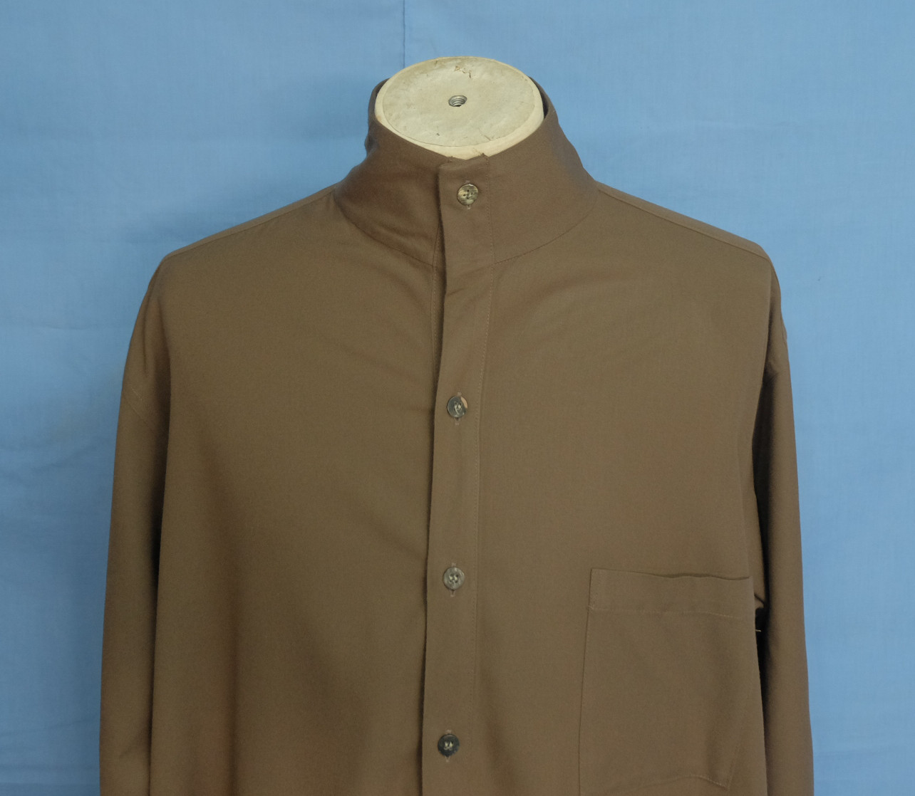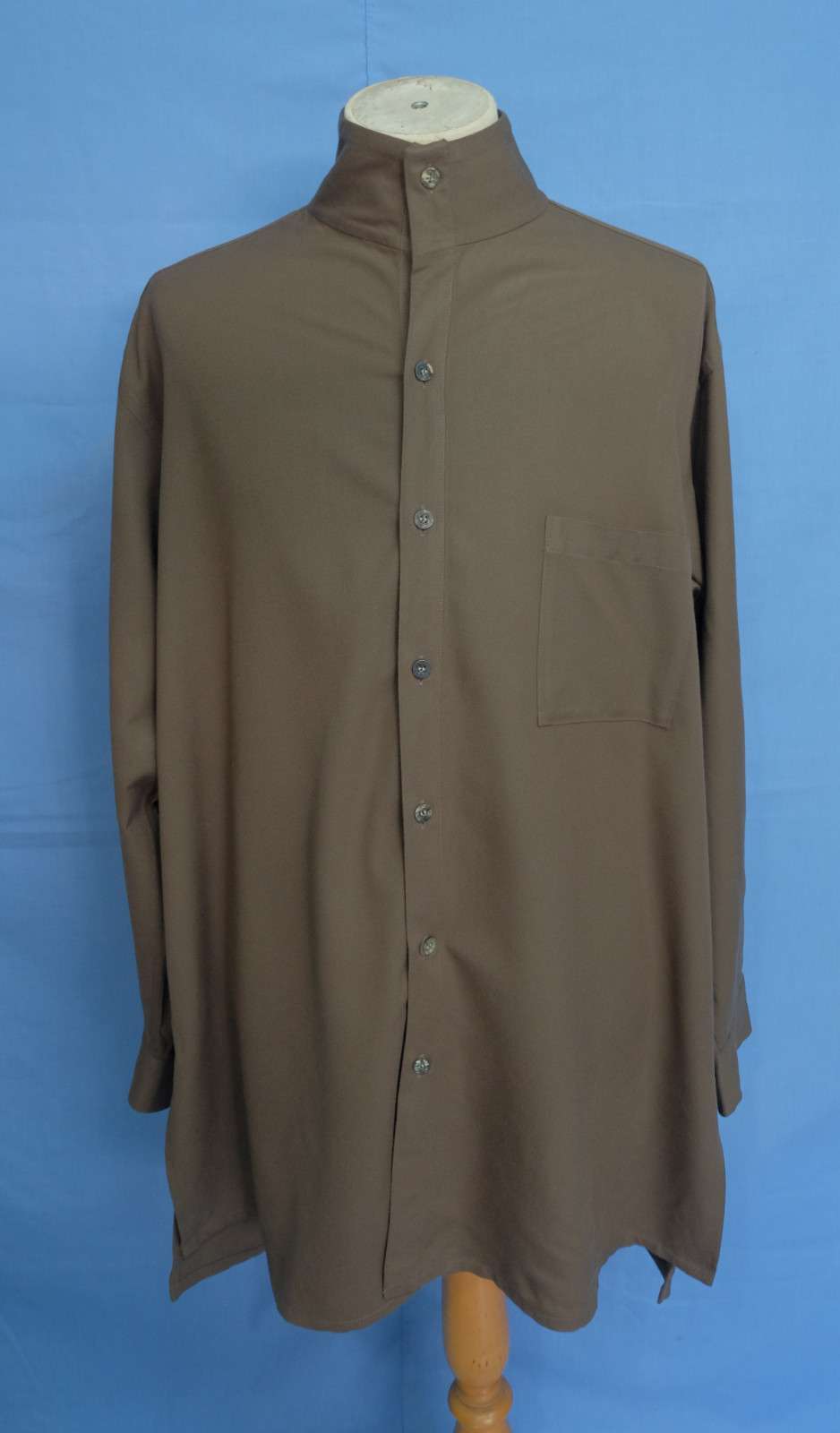Excellent Yohji Yamamoto Y's for men collarless brown acrylic men's casual shirt long sleeves with buttons front authenticity guaranteed. The shirt is pre-owned still in excellent condition, there are no holes, tears, stains. It has been laundered clean and fresh ready to wear. The shirt has collarless, single chest pocket on left with 7 mother of pearl buttons closure on front. The color is brown with solid pattern. Fabric is 100% acrylic. Don't miss out cool and awesome shirt.