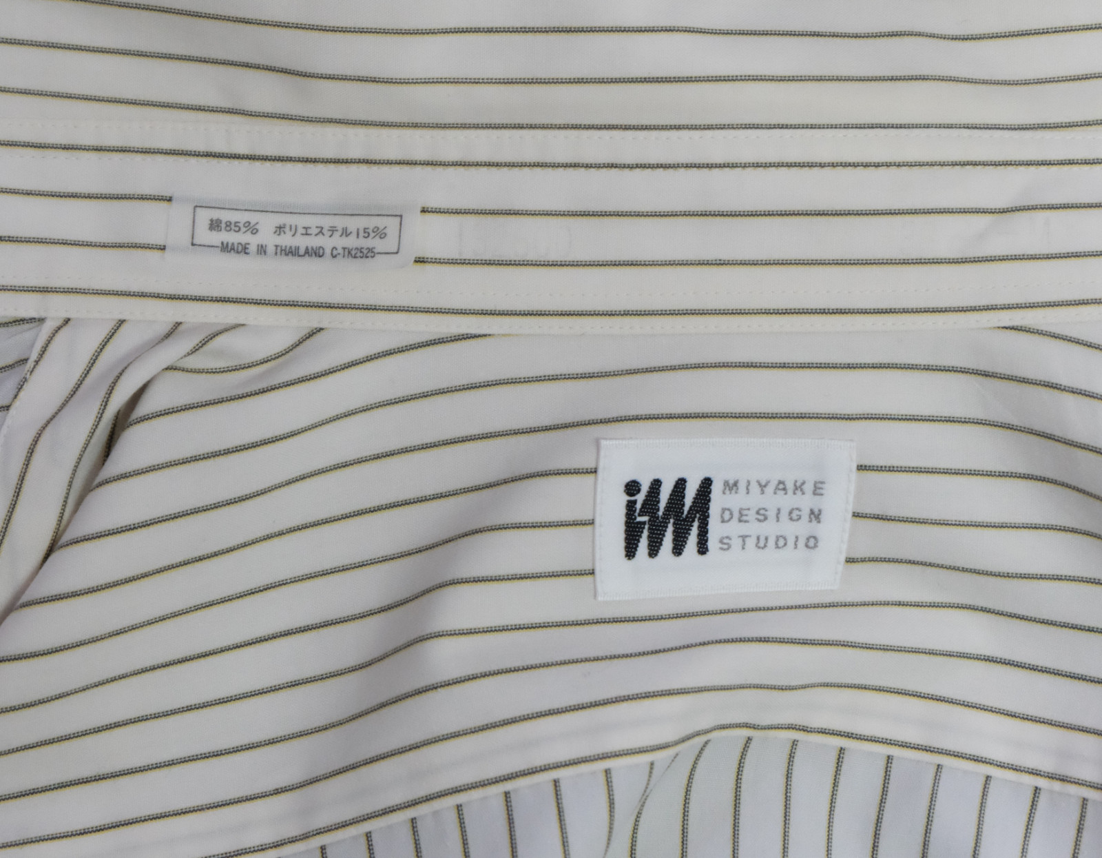 Good ISSEY MIYAKE Design Studio light cream striped men's casual shirt long sleeve with buttons front slim fitted authenticity guaranteed. The shirt is pre-owned still in good condition, there is a thin stain near right cuff of the shirt. Please see the photo. It has been laundered clean and fresh ready to wear. The shirt has point collar, single chest pocket on left with 7 mother of pearl buttons closure on front. The color is light cream, yellow, black with striped pattern. Fabric is 85% cotton, 15% polyester. Don't miss out cool and awesome shirt.