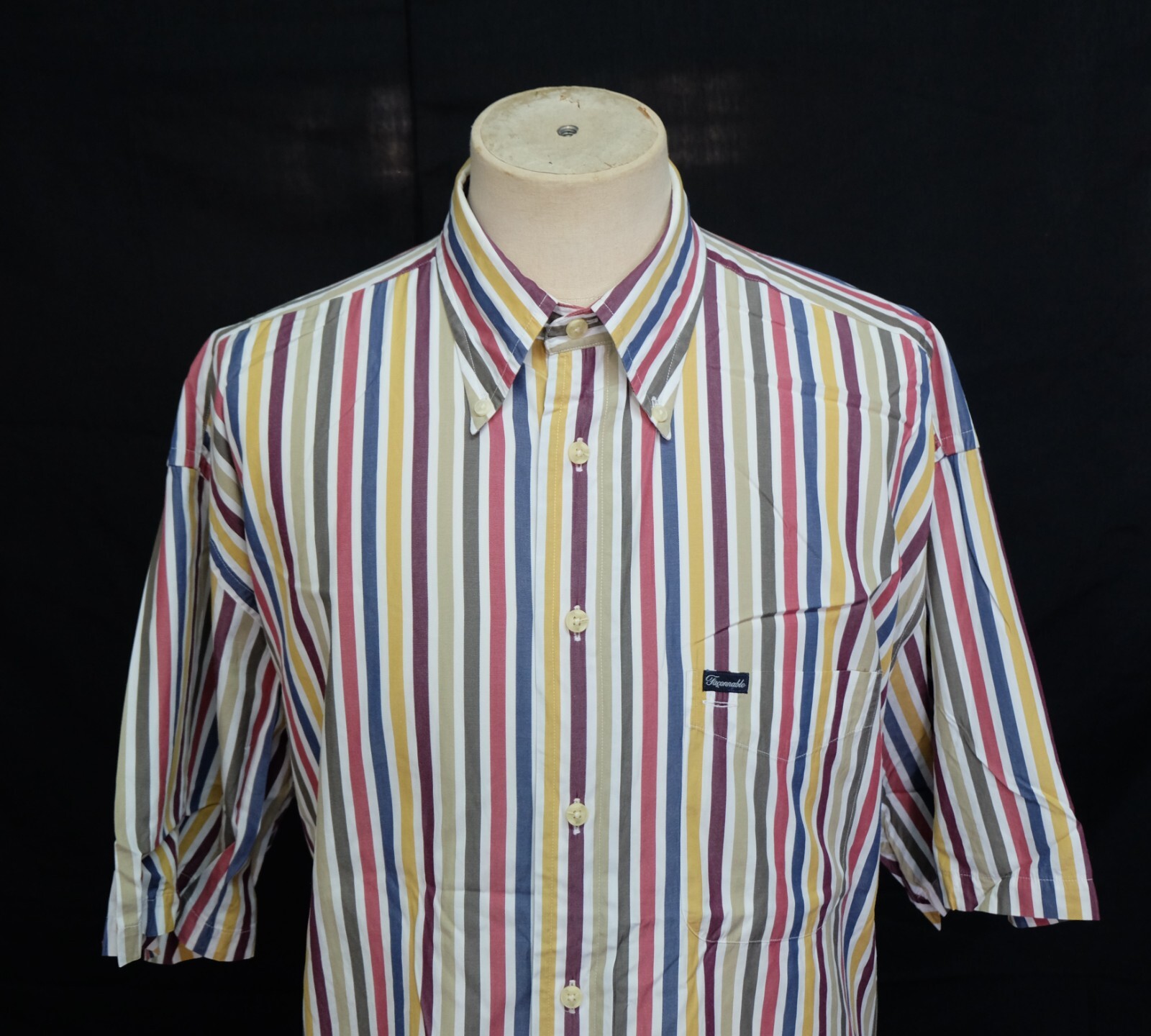 Excellent Faconnable Button-Down multicolor striped men's shirt short sleeve with buttons front authenticity guaranteed. The shirt is pre-owned still in excellent condition, no holes, tears, stains. It has been laundered clean and fresh ready to wear. The shirt has button-down collar, single chest pocket on left with 7 buttons closure on front. The color is red, cream, blue, yellow, white, wine with striped pattern. Fabric is 100% cotton. Don't miss out cool and awesome shirt.