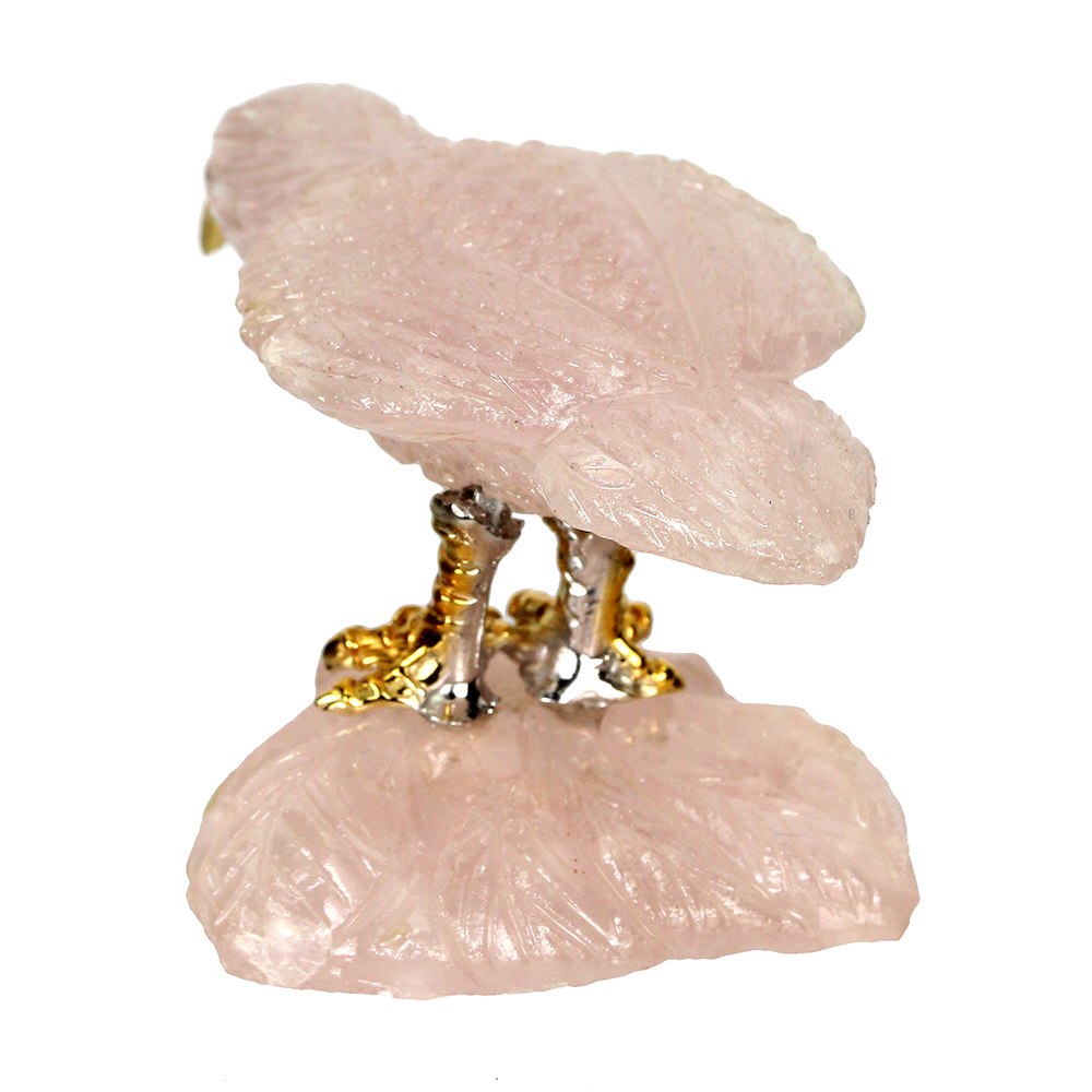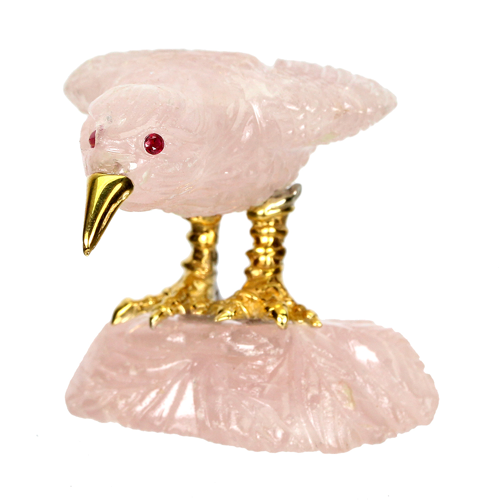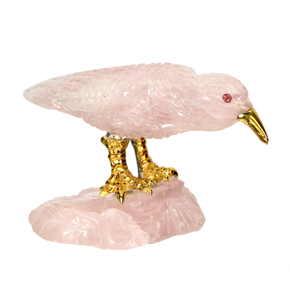 Handcrafted Rare Bird Carving Rose Quartz 56x32mm Red Sapphire 925 Silver Statue