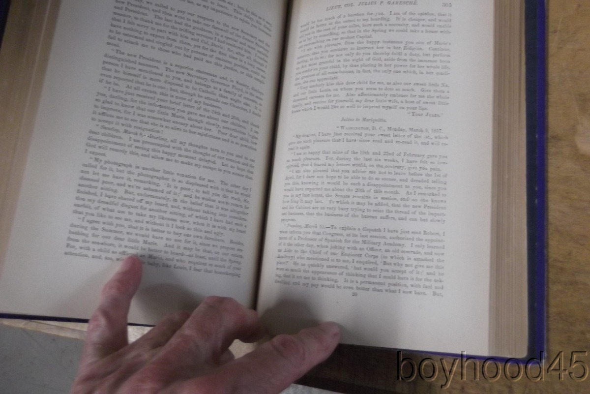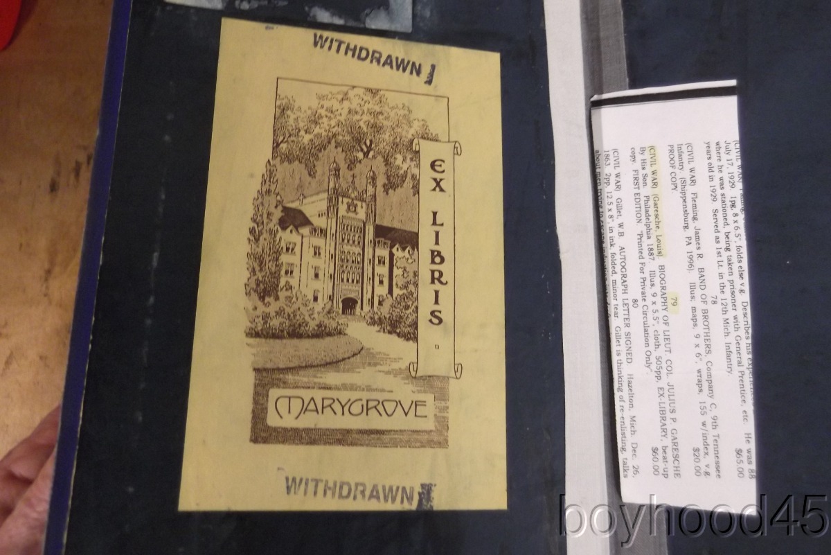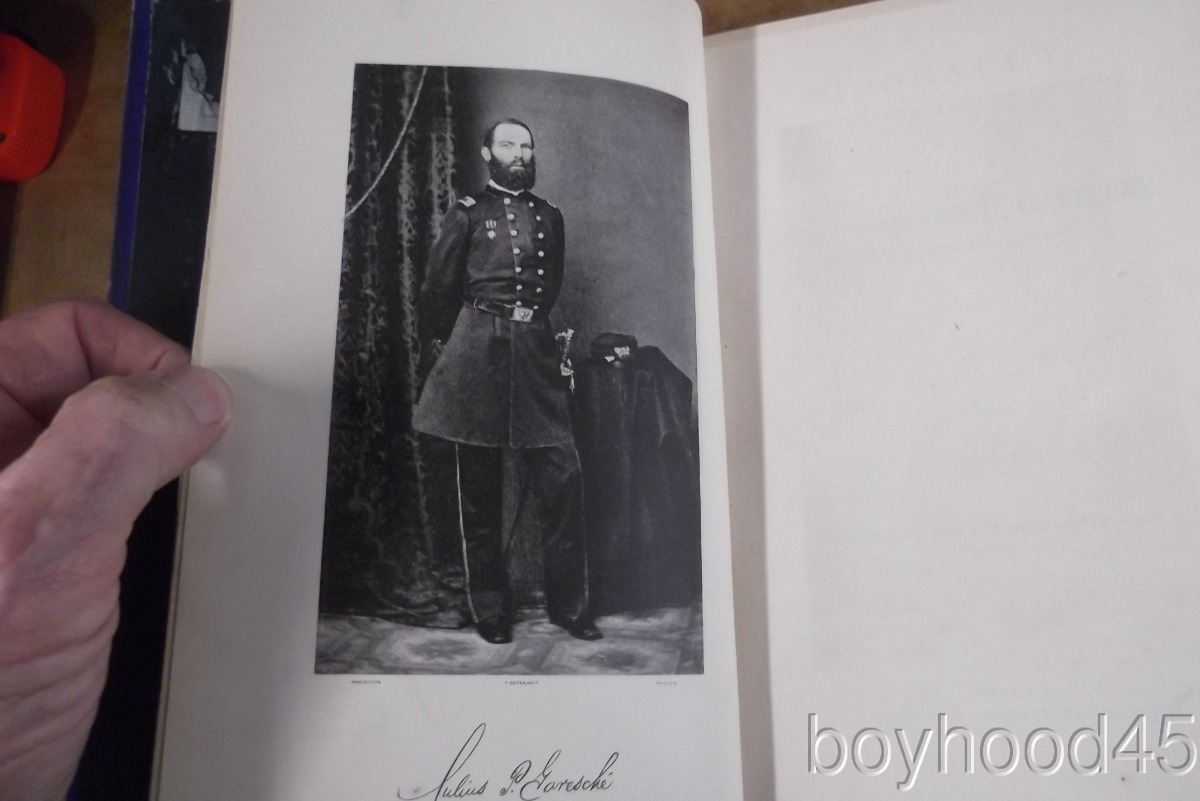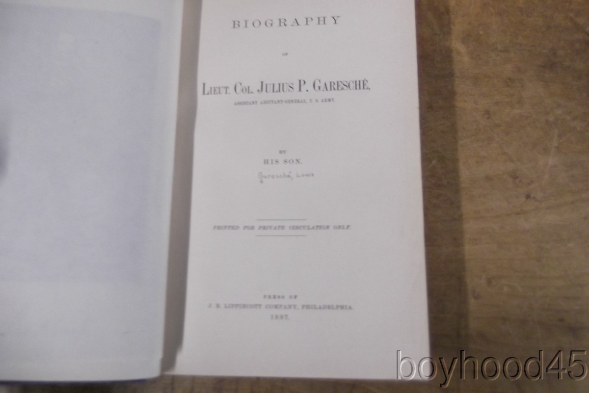 This is "Biography of Lieut. Col. Julius P. Garesche. Assistant Adjutant-General, U.S. Army" by His Son (Louis Garesche). Published by J.B. Lippincott Co., Philadelphia, 1887. First Edition. Bound in the original publisher's blue cloth binding. This is a former library holding and is so marked. Condition is Fair to Good--wear to corners and spine ends. Cover hinges are cracked and show old tape repairs. Clean, complete. Measures 6 3/8 X 9, 505 pages. I have not been able to locate any other original copies of this book in all of my internet searches--Amazon indicates that the book is "Currently Unavailable." Contemporary reprints are being offered for upwards of $66!!! I will offer this copy for only $40.00 plus $5.00 S&H in the US. Shipping costs to Canada will be considerably less than the general international rate quoted. Thanks for shopping mellowpagesrarebooks.com