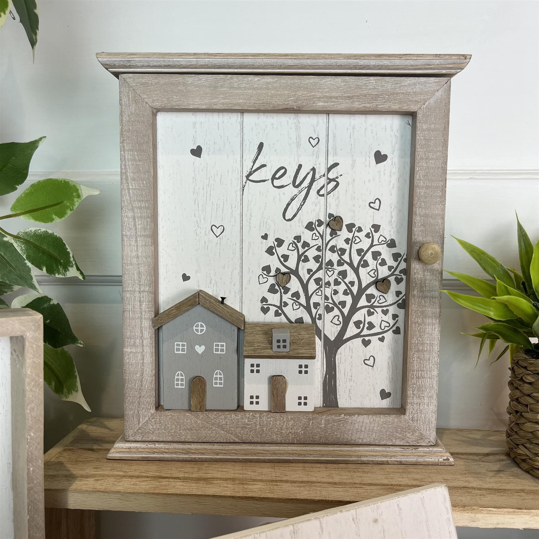 Product description A fantastic way to organise your keys no more searching drawers or hunting under sofa cushions, your keys will always be safe with this decorative box - as long as you remember to hang them here in the first place! KEY BOX: This lovely shabby chic style key box is a fantastic way to get organised, hang your keys up every night rather than frantically looking for them when you've only got 30 seconds to get out of the house, features six internal hooks for house keys, car keys, watches and any other small easy to lose items KEY CUPBOARD: This key box is both practical and stylish, purposefully produced in a distressed finished to give a rustic appearance, reads 'Keys' in nice big letters, just to remind you where you'll find them! KEY CABINET: A great addition to your home or office to help organise and tidy keys, features 6 individual hooks, each widely spaced so that each hook will hold a number of keys WOODEN KEY HOLDER FOR WALL: With its pretty muted colour tones, cute houses and heart embellishments, this delightful key cupboard would suit a range of home interiors. Dimensions 25 x 22cm WALL KEY HOLDER: This key cabinet is perfect for keeping the table and kitchen sides clear, easy to install complete with mount fitting on the back ready to hang from wall or door (wall fixtures and fitting not included) |
