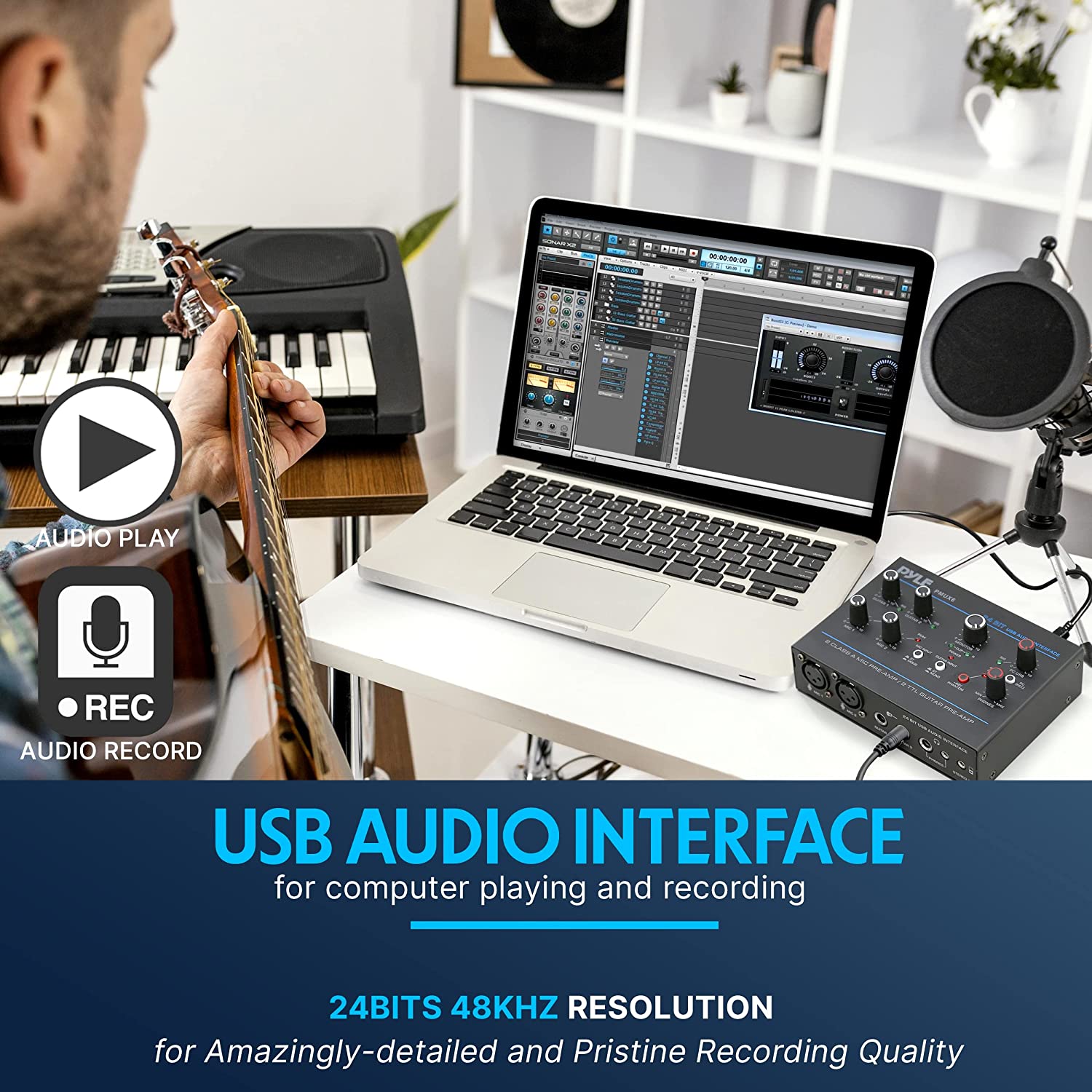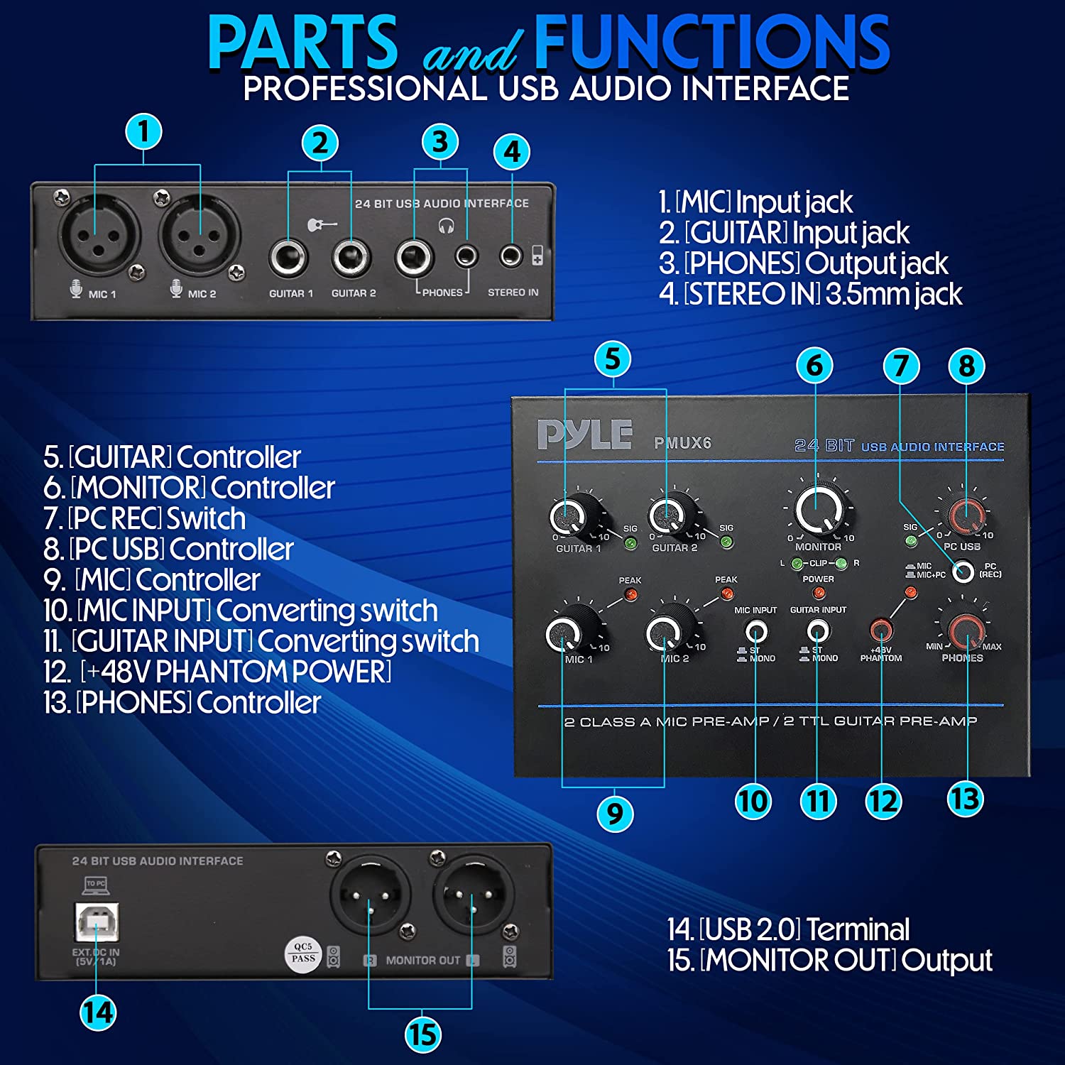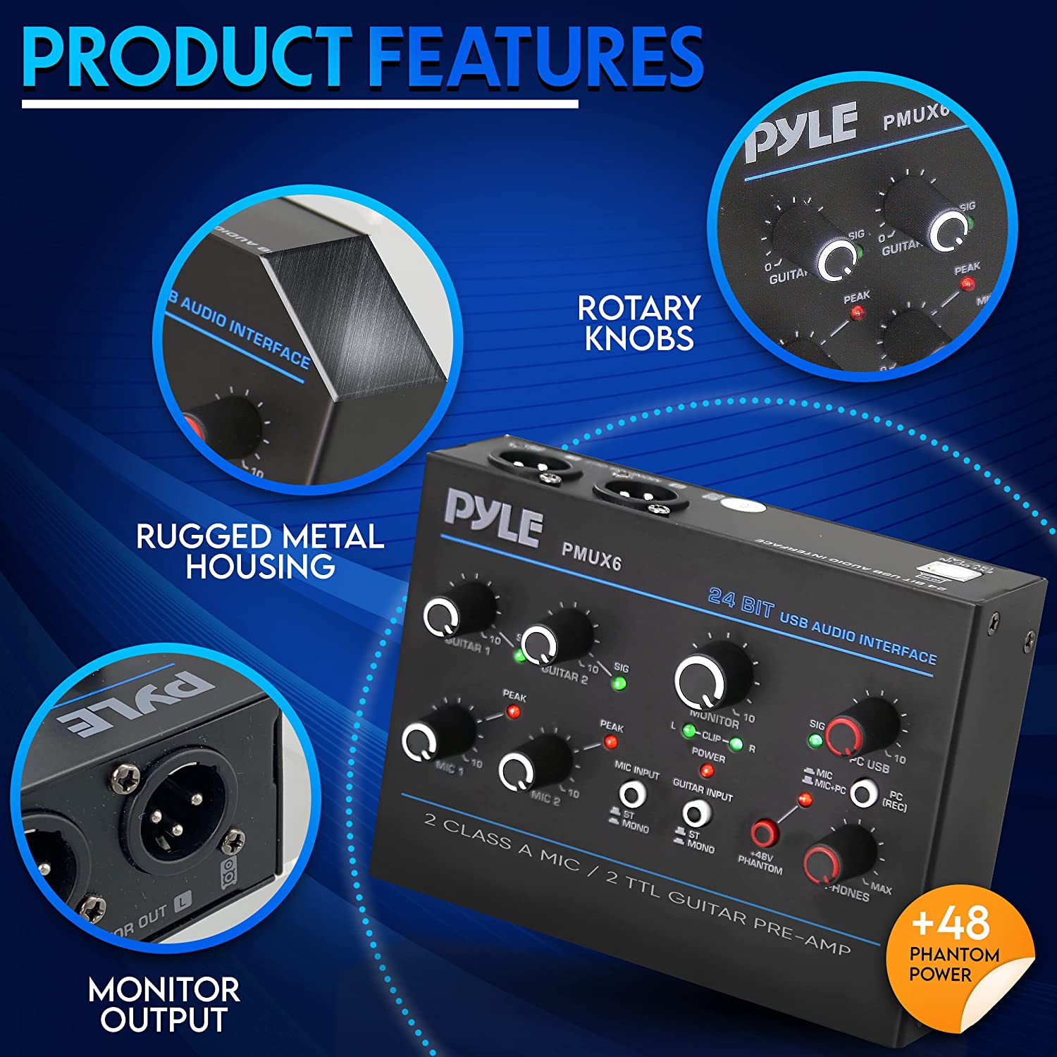 Professional USB Audio Interface with MIC, Guitar, AUX Stereo Inputs, Phone/Monitor Outputs, Ideal for Computer Playing & Recording, Compact Rugged Metal Housing - PMUX6