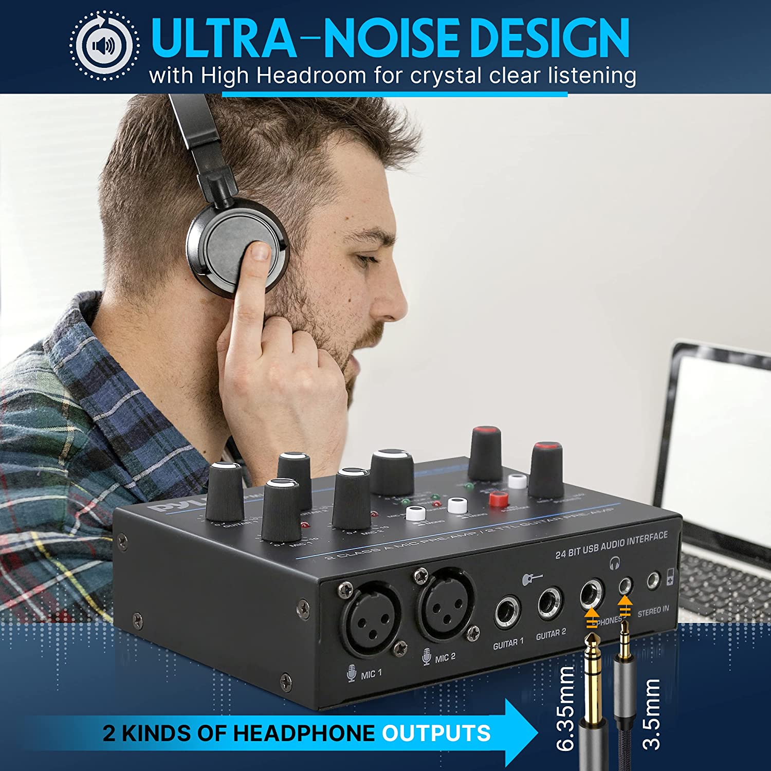 Professional USB Audio Interface with MIC/LINE, Guitar, AUX Stereo and RCA Inputs, Phone/Stereo/Monitor Outputs