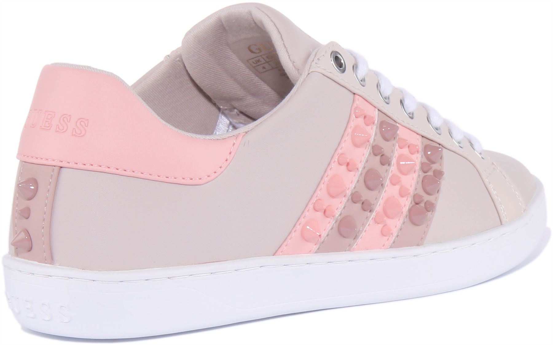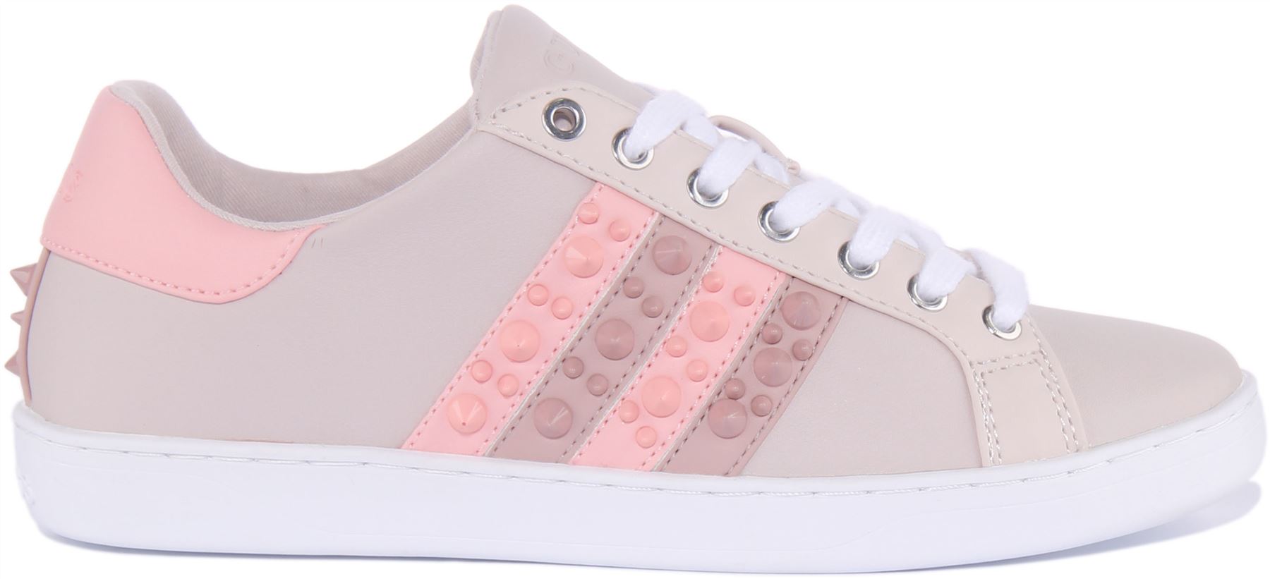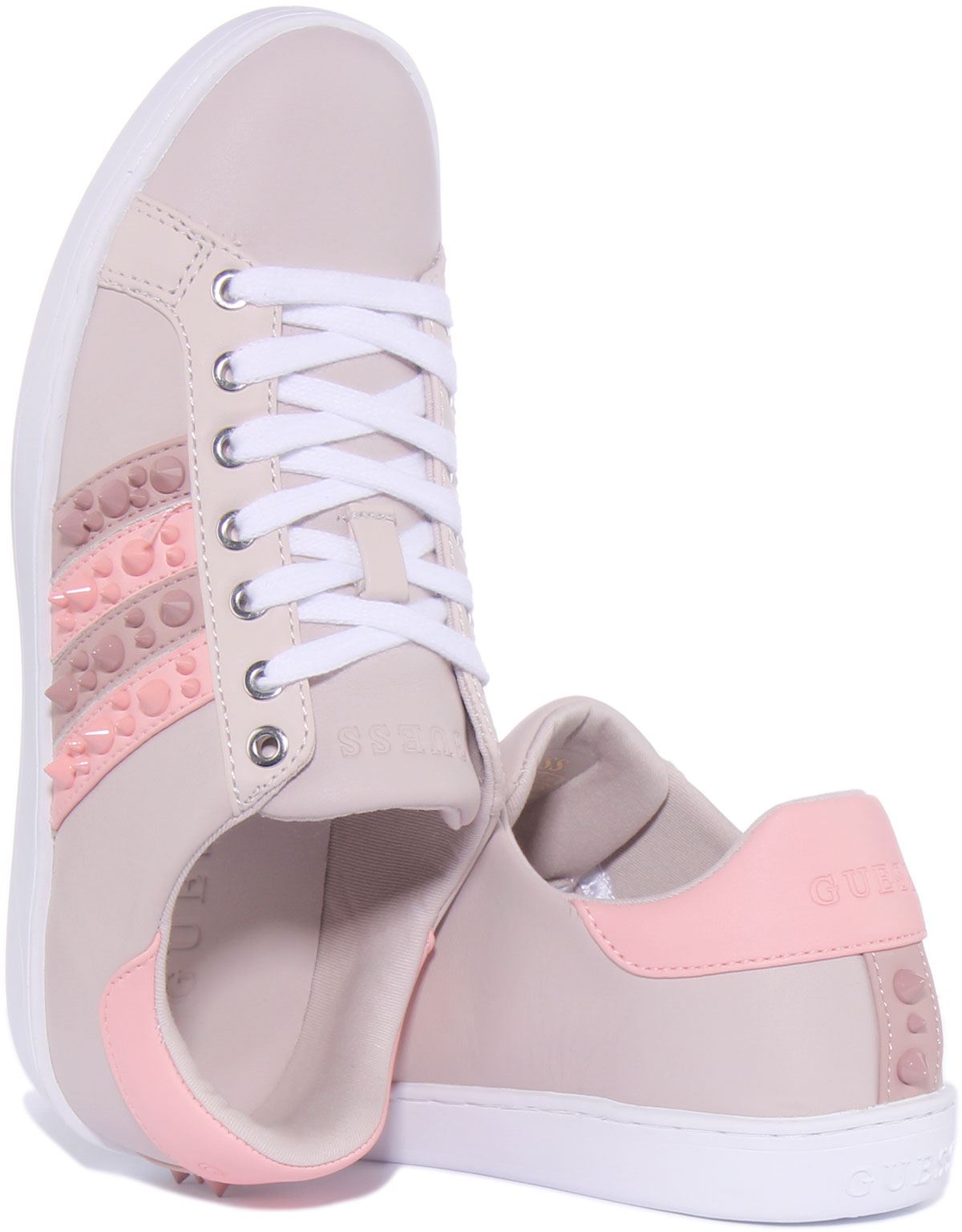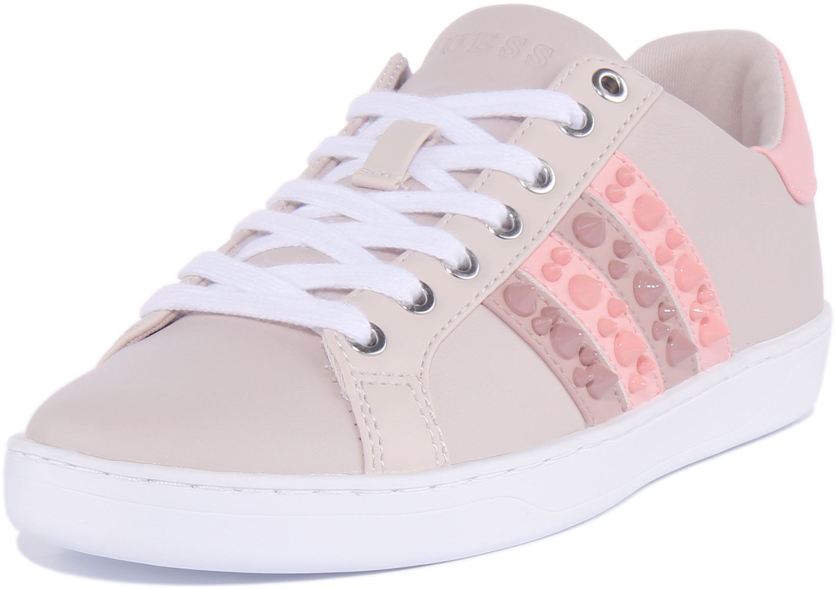 Step out in style and comfort in these Guess Jacobb sneakers. Made from leather blend materials with stud applique detail on sides, these casual sneakers feature lace up closure for a perfect fit, fabric lining for breathability, leather insole for comfort and rubber outsole for excellent traction. Finished with signature Guess branding, these sneakers are perfect for everyday wear.