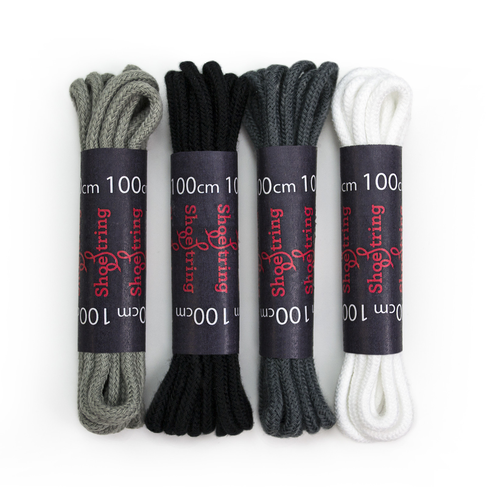 Our high-quality round shoelaces are made from a cotton mix. This makes the laces strong and also prevents the lace from deteriorating from water, snow and dirt. The composition of ShoeString round laces means that they have a matt finish, unlike polyester or nylon laces which are shiny.