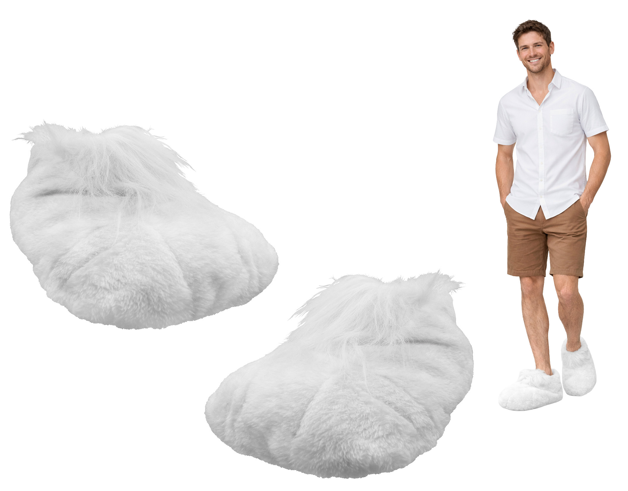Complete your look this season with these Adult Size White Fuzzy Bunny Feet Slipper Covers. Perfect for Easter, Cosplay, Halloween, and more! Each set includes both left and right foot that features a furry like slipper with faux fur at the opening. Stands about 5.5 inches tall. Great for Rabbits, Dogs, Cats, Fox, and more animals! Slipper features a soft sole with anti-slip dots. Each shoe slipper fits a Men's foot/shoe size 10.5 and measures about 13 inches long, is about 8 inches wide at the widest part of the bottom. Best when shoes are not used. For smaller sized feet, add stuffing in the front. Spot clean only. For ages 14 and older.