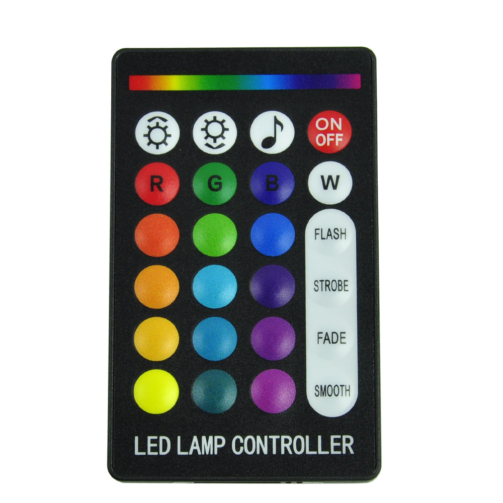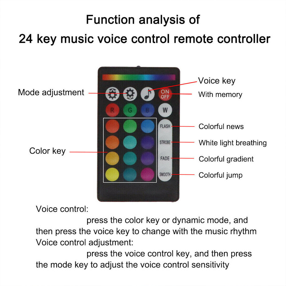 Static 15 color (red, green, blue, yellow, mixed white, pure white, cyan, purple, etc.) and RGB light change, fade, jump, spark and adjust brightness, mode speed and sound sensitivity adjustment.