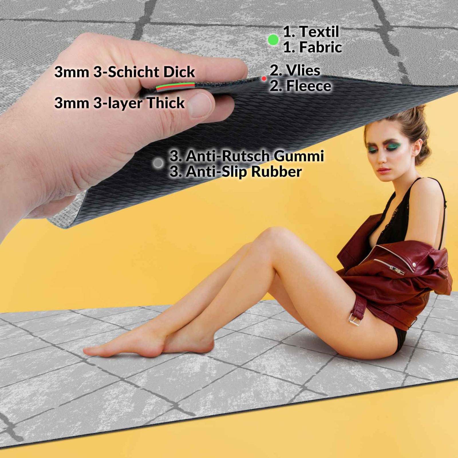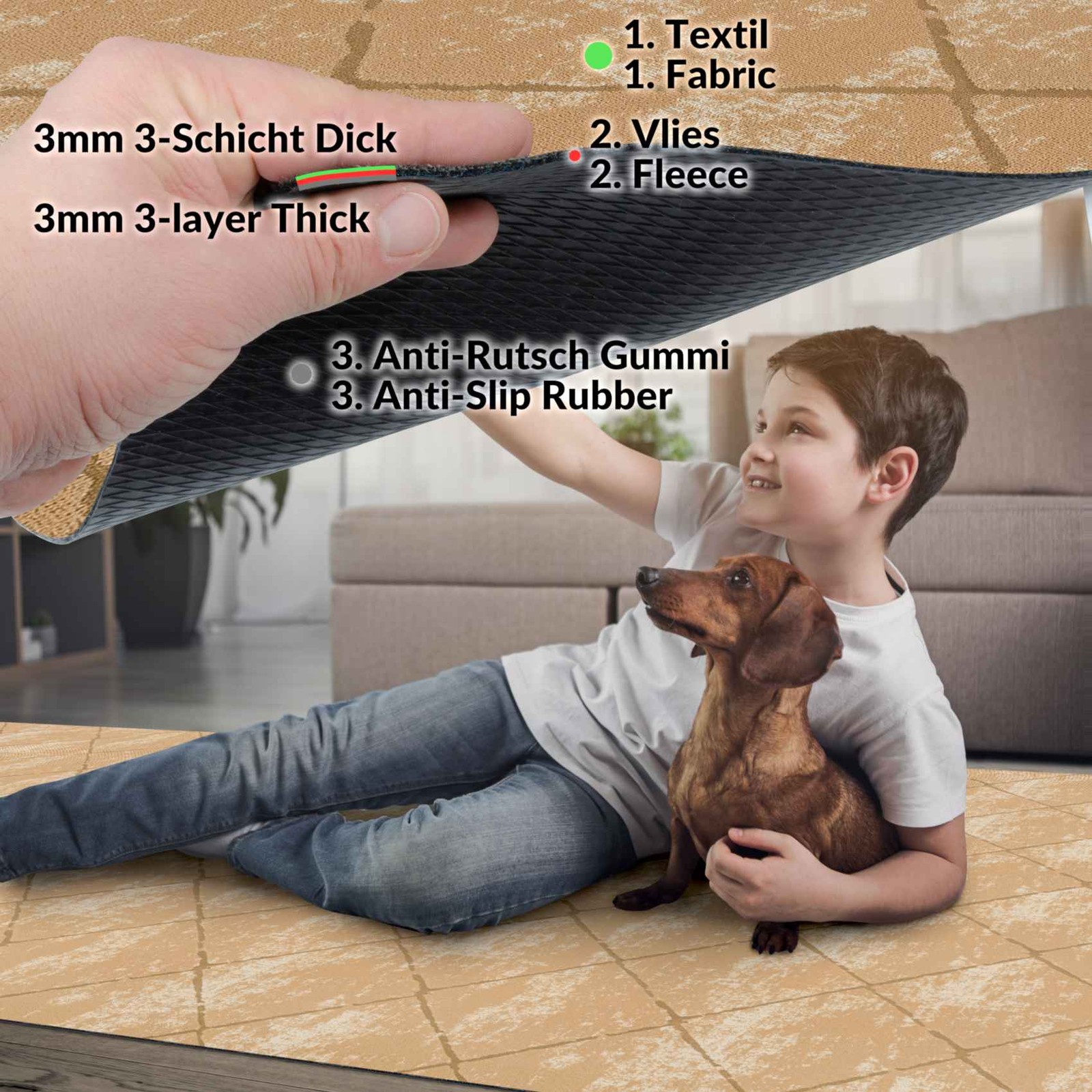 Unser moderner Teppich Läufer ist genau das Richtige für alle, die schlichte Eleganz mit dem gewissen Etwas suchen. Die gedeckten Farben in Grau, Beige und Schwarz mit dem geometrischen Muster, das sich teilweise farblich absetzt, sind ein Hingucker in Ihrem Wohnraum. Der Küchenteppich aus ultra weichem Velour Material sorgt für Gemütlichkeit überall dort, wo er verwendet wird. Und die Einsatzmöglichkeiten des Teppichläufers sind vielfältig: Sowohl als Flur Läufer, als auch als Küchenläufer oder Wohnzimmerteppich ist unser Läufer sehr beliebt.
