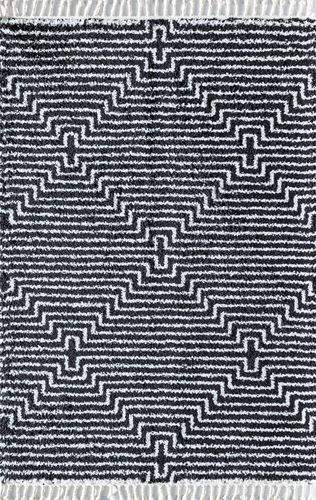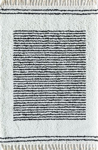 Soft white and dusty blue bring out the best features of this masterpiece; the dynamic color duo effortlessly adds warmth and light to your space. Featuring a lusciously plush pile, this durable rug will not only add charm and modern appeal, but it will also cradle each of your footsteps for maximum comfort. A gorgeous striped pattern graces this accent rug, and a trim of tassels bring a fun flair to complete the look. This contemporary collection of shaggy rugs is inspired by nature and shapes from life. The bold pattern revives the traditional shag, boasting abstract artisan markings on a nostalgic texture. This rhythmic design and cloud-like quality will invoke comforting feelings of moments remembered. These designs offer braided tassels on either end for added movement and texture. Sizes: 2-ft 6-in x 4-ft 0-in,2-ft 6-in x 8-ft 0-in Runner,5-ft 0-in x 7-ft 0-in,8-ft 3-in x 10-ft 0-in Pile Features: Shag Soft Touch