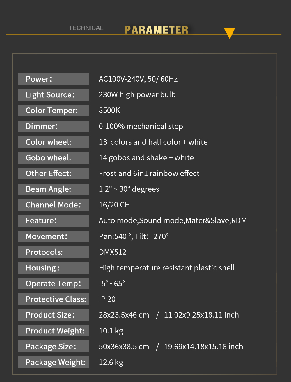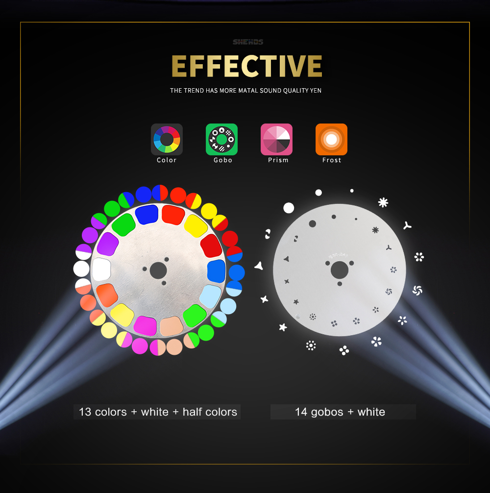 Gobo Wheel: 14 gobos and shake+white