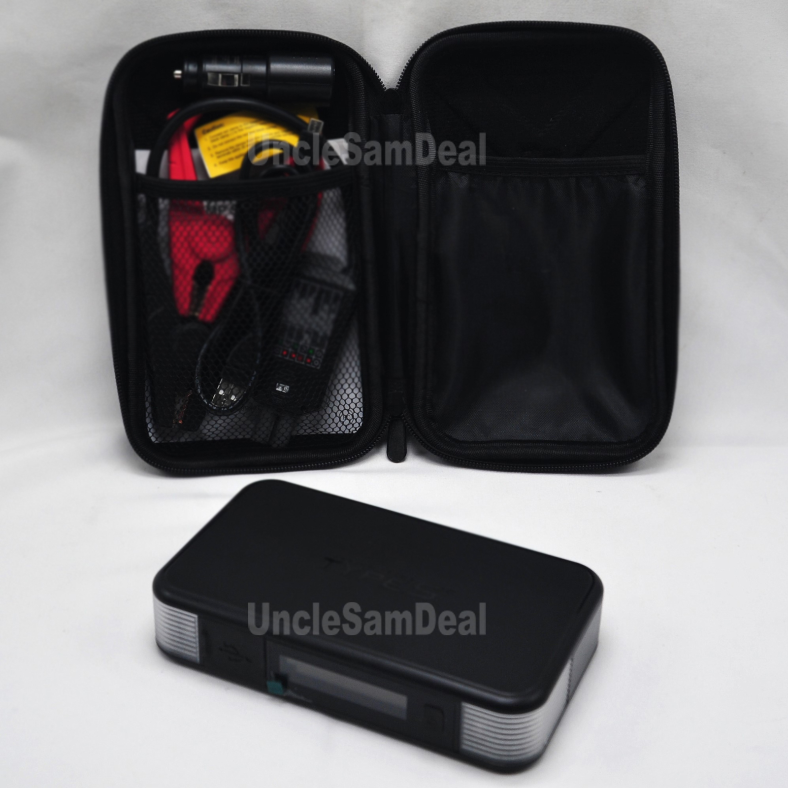 - COME WITH CAR CHARGER, CABLE, CARRYING CASE JUMP START CABLE CLAMP.