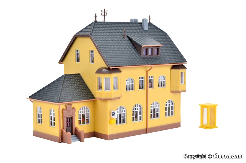 Kunststoff-Bausatz für Postamt Munderkingen. Fein detailliert und auch in moderneren Epochen einsetzbar, wird das Postamt Munderkingen mit seinen beiden angesetzten Erkern zum wunderschönen Blickfang, denn eine richtige Poststelle darf auf einer Modellbahn natürlich nicht fehlen. Ob der Briefkasten heute wohl schon geleert wurde?