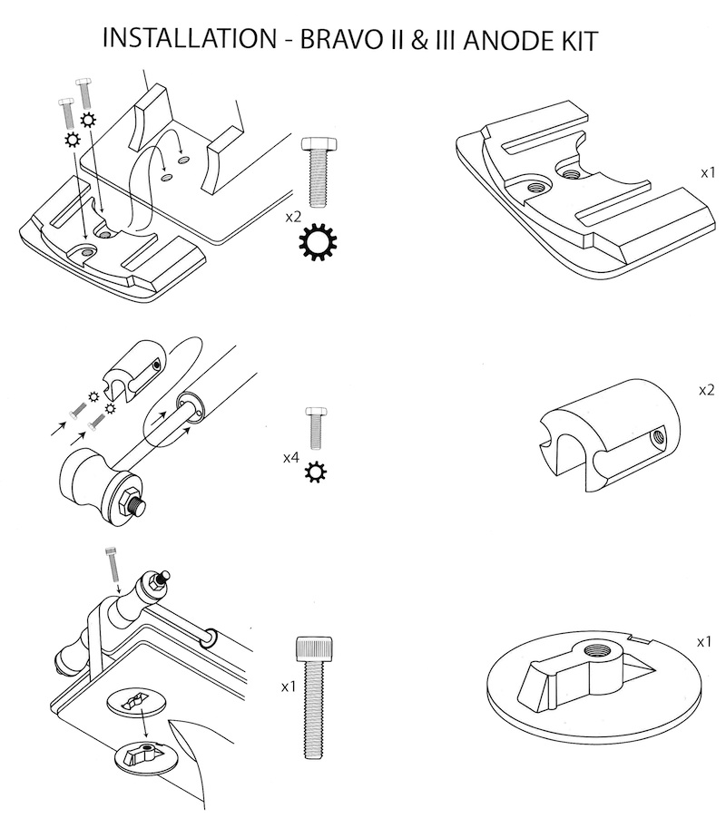 Bravo 2 und 3 Produktnummer: TEKITBRAVOII-IIIMG - Hersteller: Tecnoseal / made in Italy - für Mercruiser Bravo 2 ab Baujahr 1989 - für Mercruiser Bravo 3 Baujahr 1989 bis 2003 Achtung, dieses Kit BEINHALTET NICHT die zweite Telleranode und die Propelleranode für Bravo 3! - für Süßwasser - inkl. Schraube und Montageanleitung |