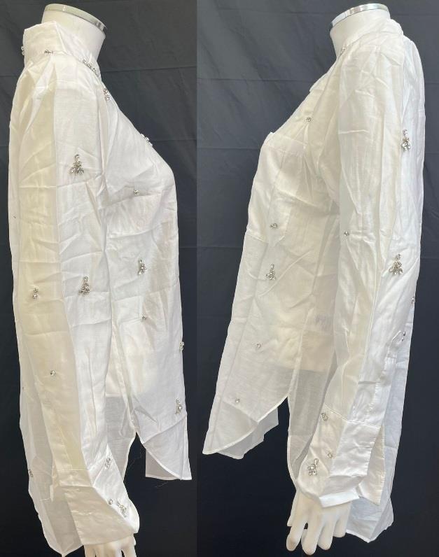 ZARA WHITE LOOSE FIT OVERSIZED RHINESTONE APPLIQUE SHIRT ASYMMETRIC CURVED HEM VENTED SIDES