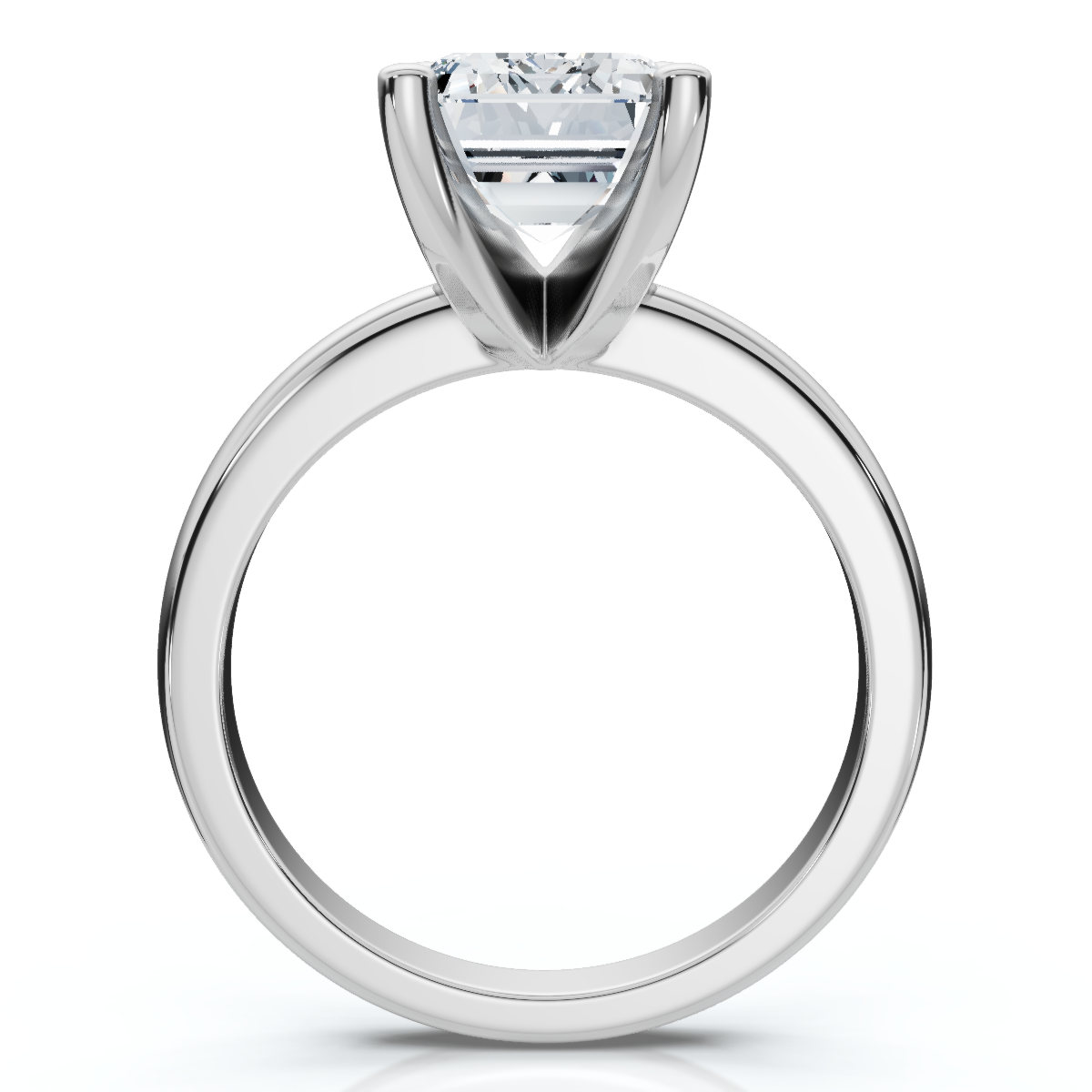 This high quality women's engagement ring features a 9x7mm emerald cut genuine moissanite. The stone is four prong set in solid 14k gold high polished mounting. This classic and affordable ring is something you can enjoy forever.