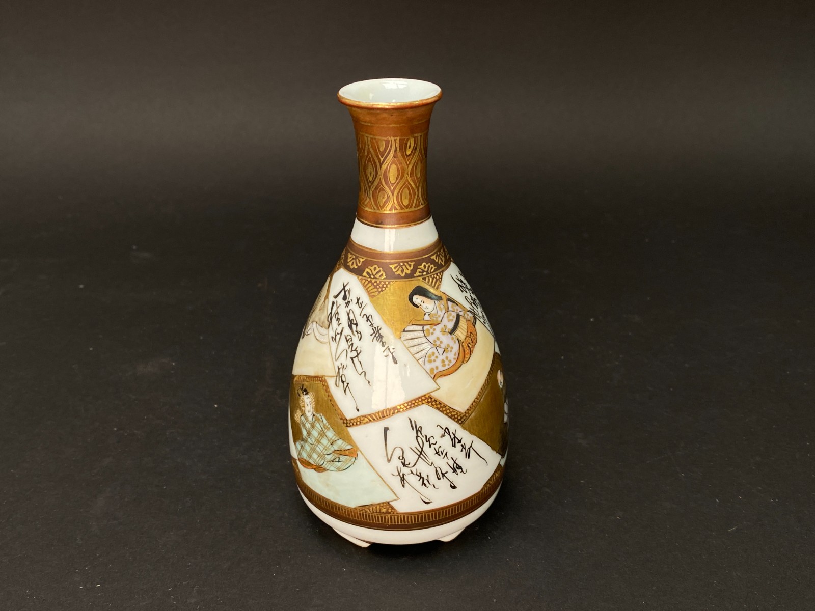 During the Meiji Period (1868-1912) in Japan, this Kutani Ware porcelain pot was crafted specifically for sharing sake. The design boasts large panels adorned with depictions of people in portrait, Haiku and poem, complemented by gilt flowers and Satsuma-style decorations on a warm background. The pot was skillfully made and painted at the Kutani kilns in Kaga prefecture. As an antique Japanese piece, it can also serve as a Geisha or Sake Pourer.