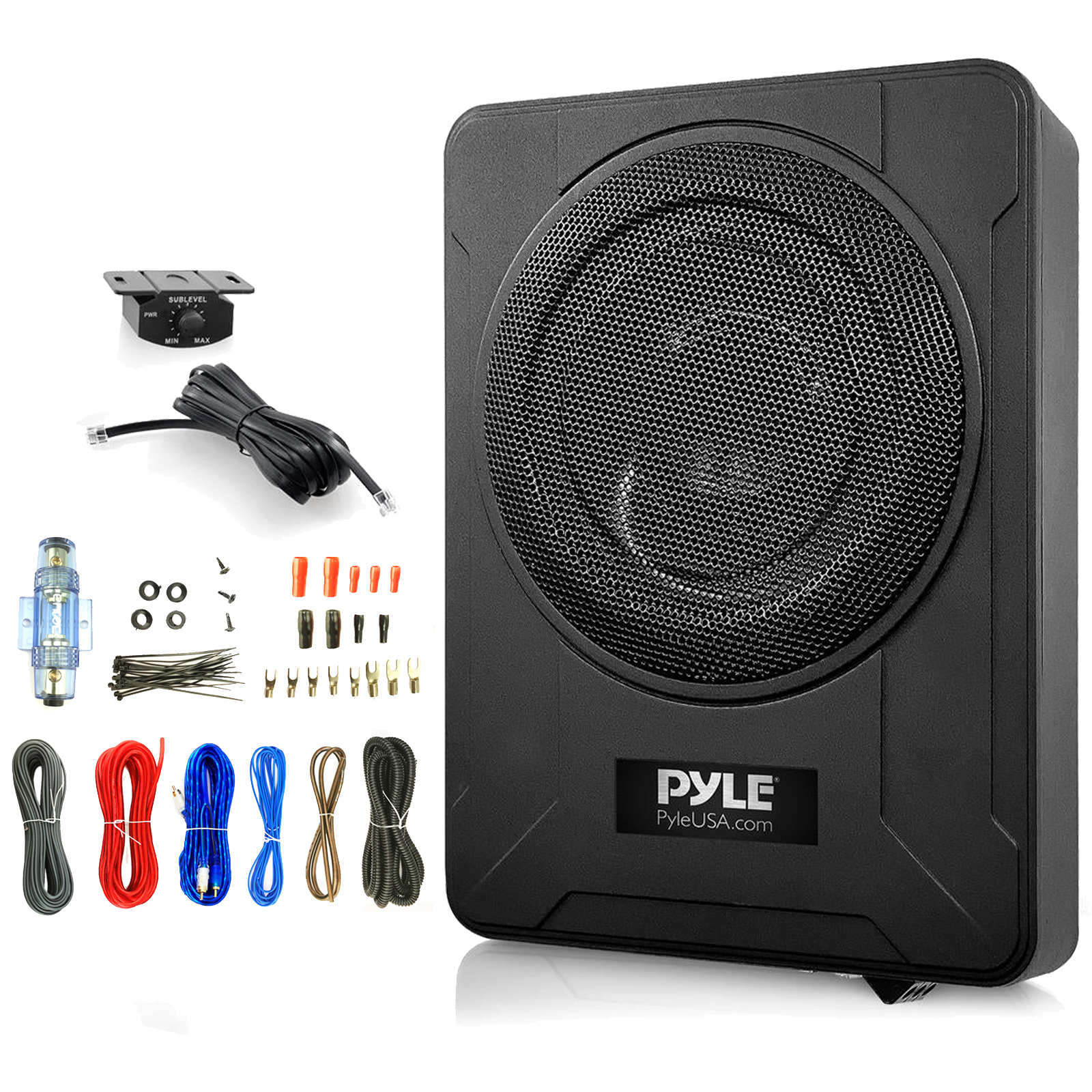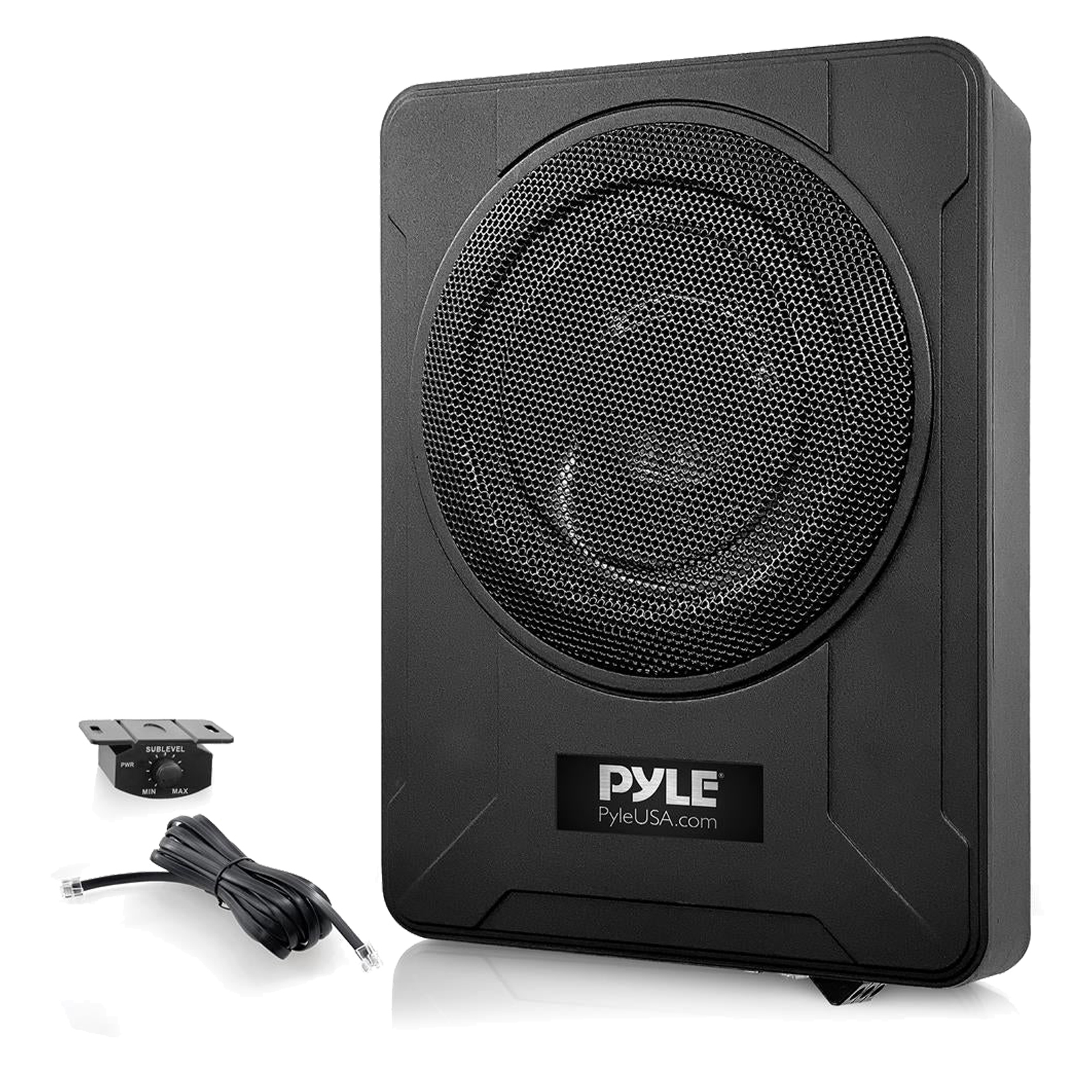 8” 600 Watts Low-Profile Active Amplified Car Audio Subwoofer System, Suitable for Under-seat Installations Pyle - PLBX8A This Pyle low profile amplified subwoofer is designed to be low enough to easily fit below the seat of your car. Featuring low pass crossovers, controls for adjusting the input sensitivity and for further flexibility a variable bass boost control has been included. You can control the subwoofer level with the remote level control module. Features: