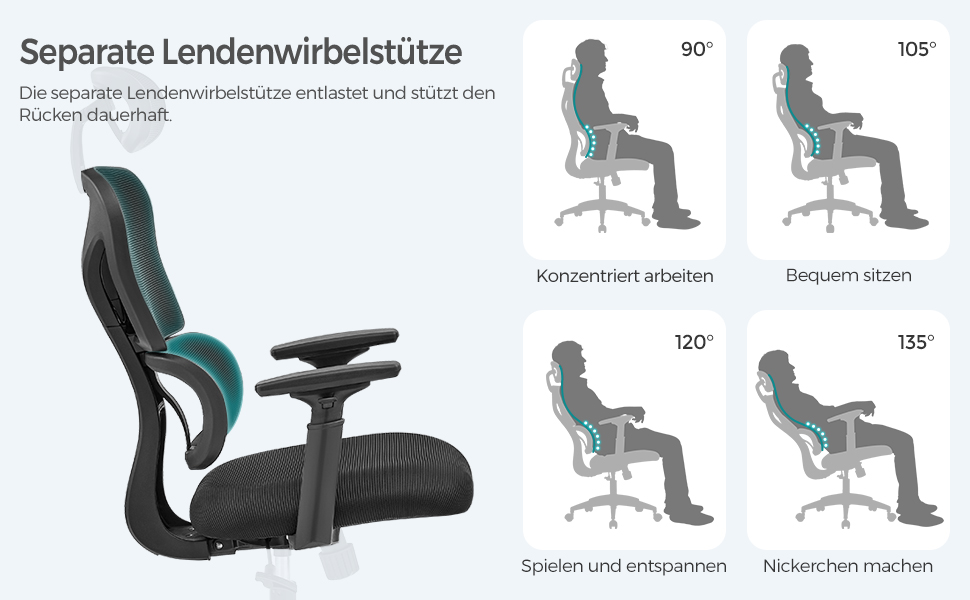 [Separate Lendenwirbelstütze] Dieser Bürostuhl verfügt über eine separate Lendenwirbelstütze mit ergonomischem Design, die sich eng an Ihren Körper schmiegt, damit Sie es bei der Arbeit bequem haben, auch wenn Sie über einen längeren Zeitraum sitzen