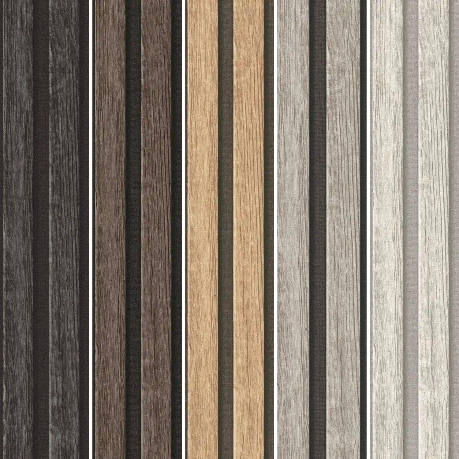 Bring a modern feel to your home with this fantastic wood slat wallpaper. This wallpaper features a wooden slats style print in a variety of colourways (listed below), set on a textured vinyl for a truly contemporary wallcovering.