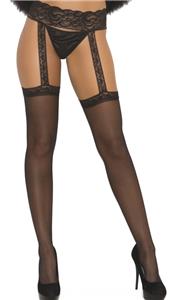 - Description: Sheer thigh high stockings with attached lace garter belt. Panty not included.
