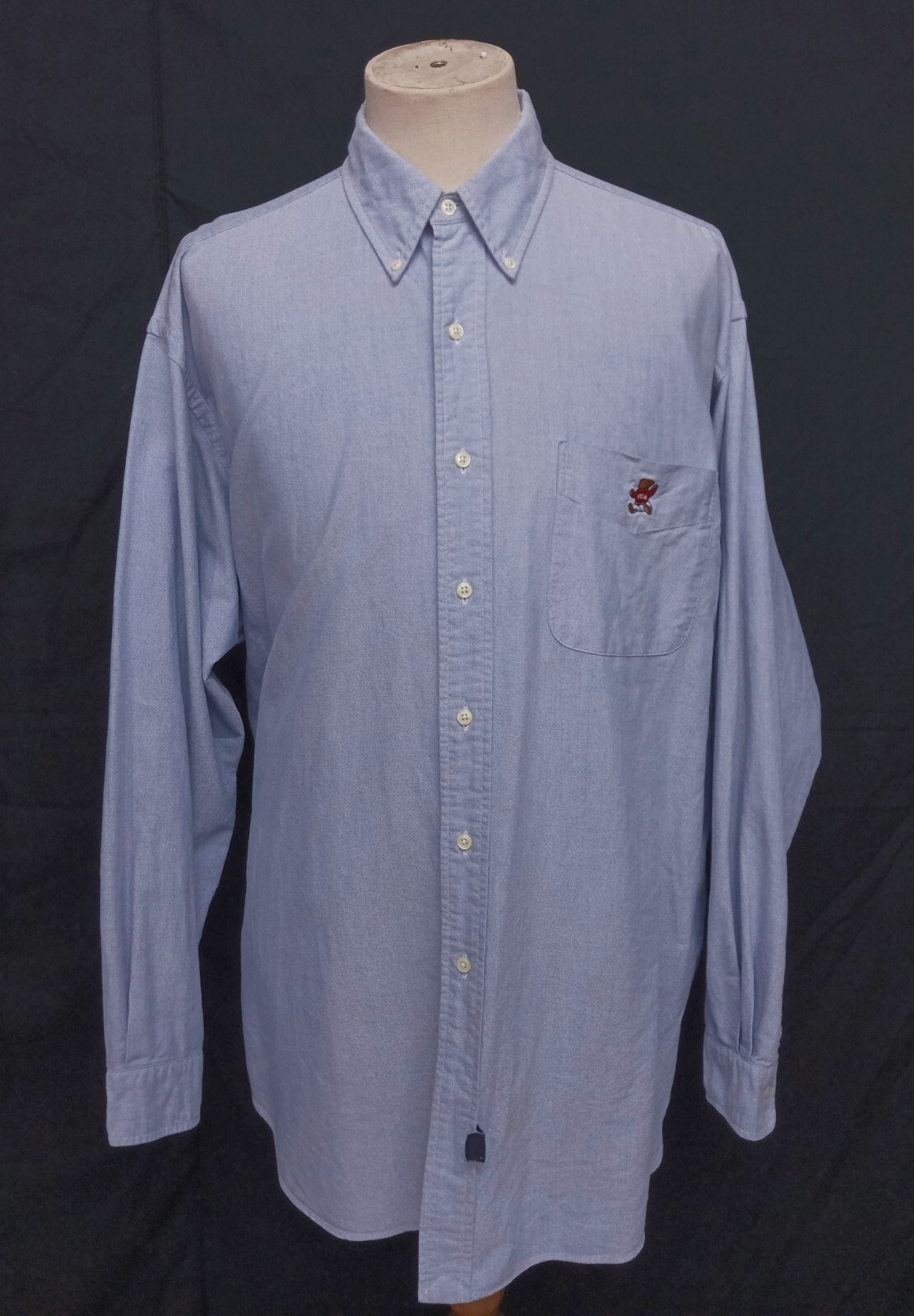 Excellent vintage 90's Polo Ralph Lauren bear light blue men's shirt long sleeves with buttons front authenticity guaranteed. The shirt has button-down collar, single chest pocket embroidered with bear logo on left. 7 buttons closure on front. The color is light blue with solid pattern. Fabric is 100% oxford cotton. The shirt is pre-owned still in good condition, there are some stains on the shirt. Please see the photos. It has been laundered clean and fresh ready to wear. Don't miss out cool and awesome shirt.