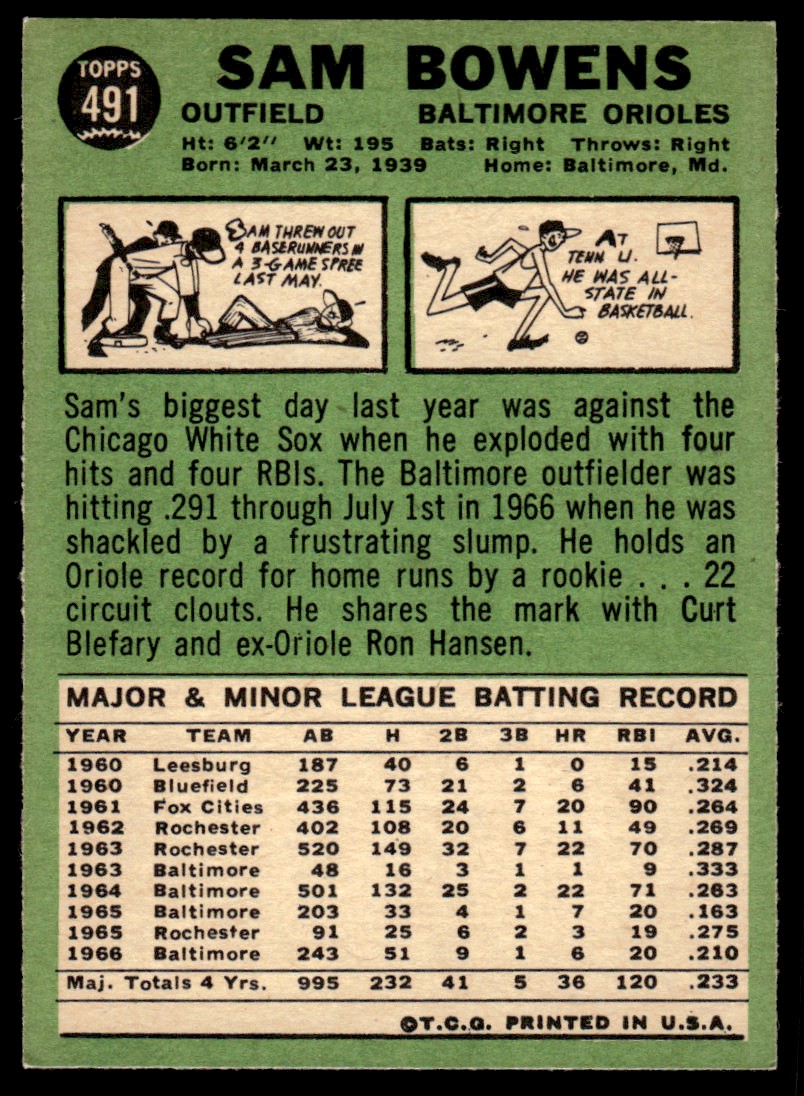 | Description: | Sam Bowens | | Category: | Baseball | | Year: | 1967 | | Product: | Topps | | Team: | Baltimore Orioles | | Card Number: | 491 | | Dimensions: | 3½" x 2½" |