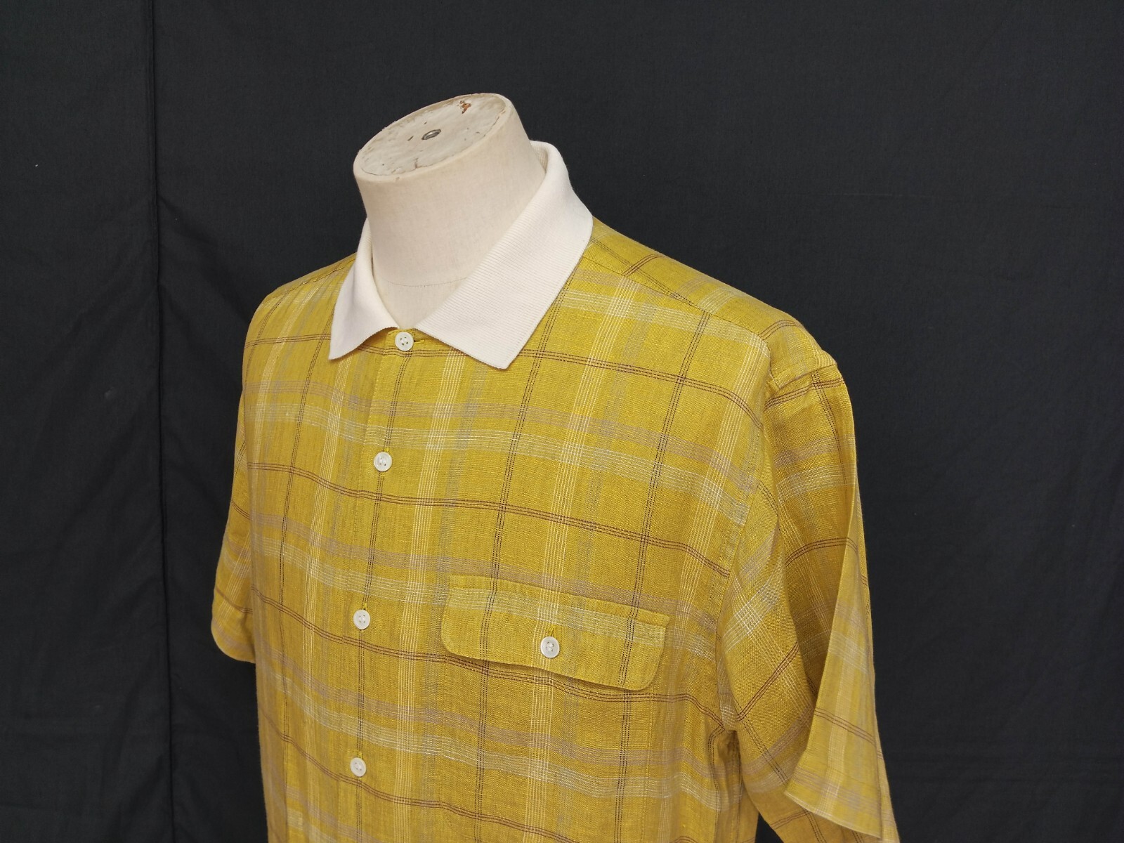 Awesome vintage Christian Dior sport soft linen knit collar gold plaid men's casual shirt authenticity guaranteed. Check out awesome vintage designer shirt short sleeves with buttons front. The shirt has knit collar, single chest button pocket with flap on left. 7 mother of pear buttons closure on front. The color is gold with plaid pattern. Fabric is 100% soft linen. The shirt is pre-owned still in excellent condition. It has been laundered clean and fresh ready to wear. Don't miss out cool and awesome vintage designer shirt.