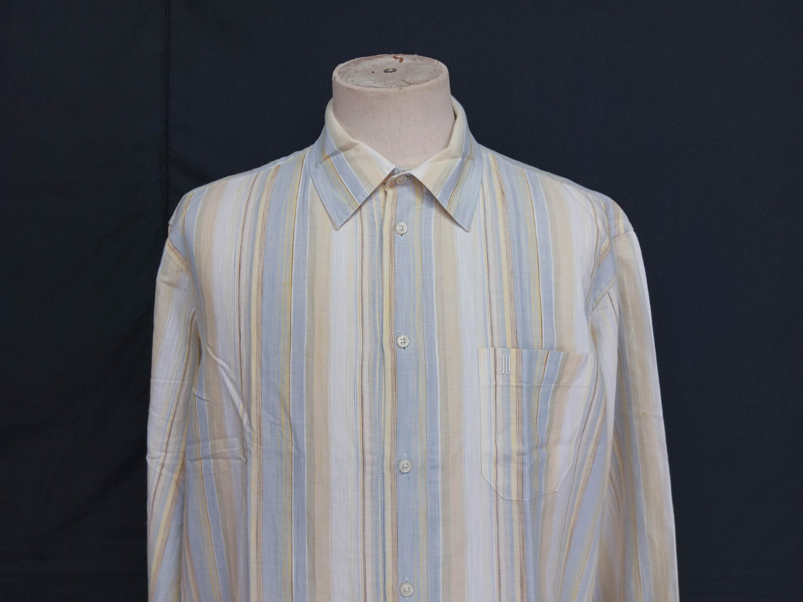 Awesome LANVIN Collection multicolor striped men's casual shirt short sleeve with buttons down authenticity guaranteed. The shirt has point collar, single chest pocket with embroidered logo on left, 7 buttons closure on front. The color is yellow, cream, light blue, brown with striped pattern. Fabric is 50% cotton, 50% linen. The shirt is pre-owned still in excellent condition no holes, tears, stains. It has already laundered clean and fresh ready to wear. Don't miss out cool and awesome designer shirt.