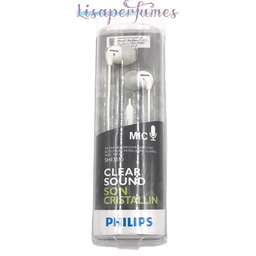 |  | | Brand | Philips | | Name | Clear Sound In Ear Headphones With Mic SHE3595 | | Gender | N/A | | Type | In Ear Headphones | | Size | 1 Headphone | | Packaging | New In Box |