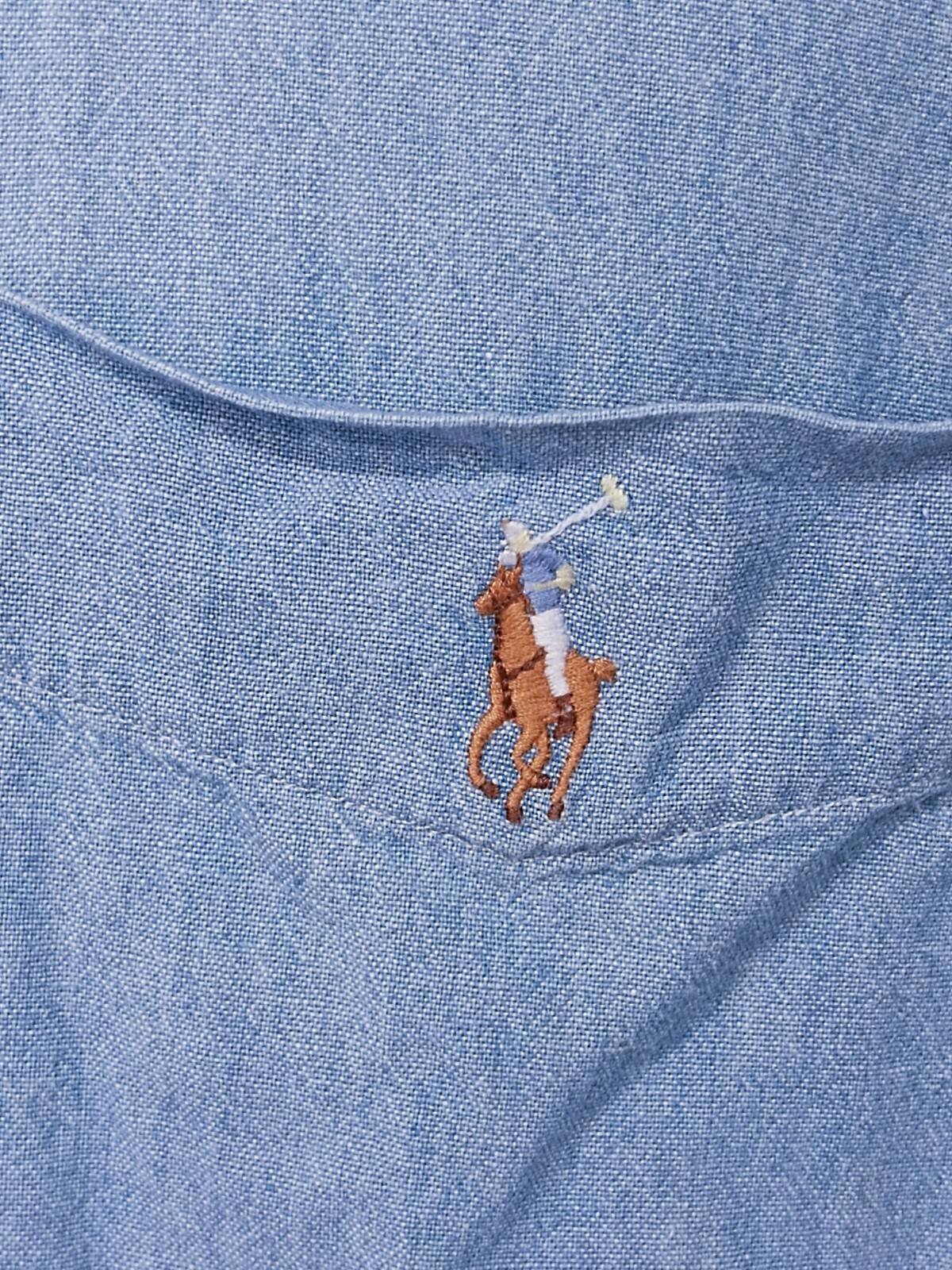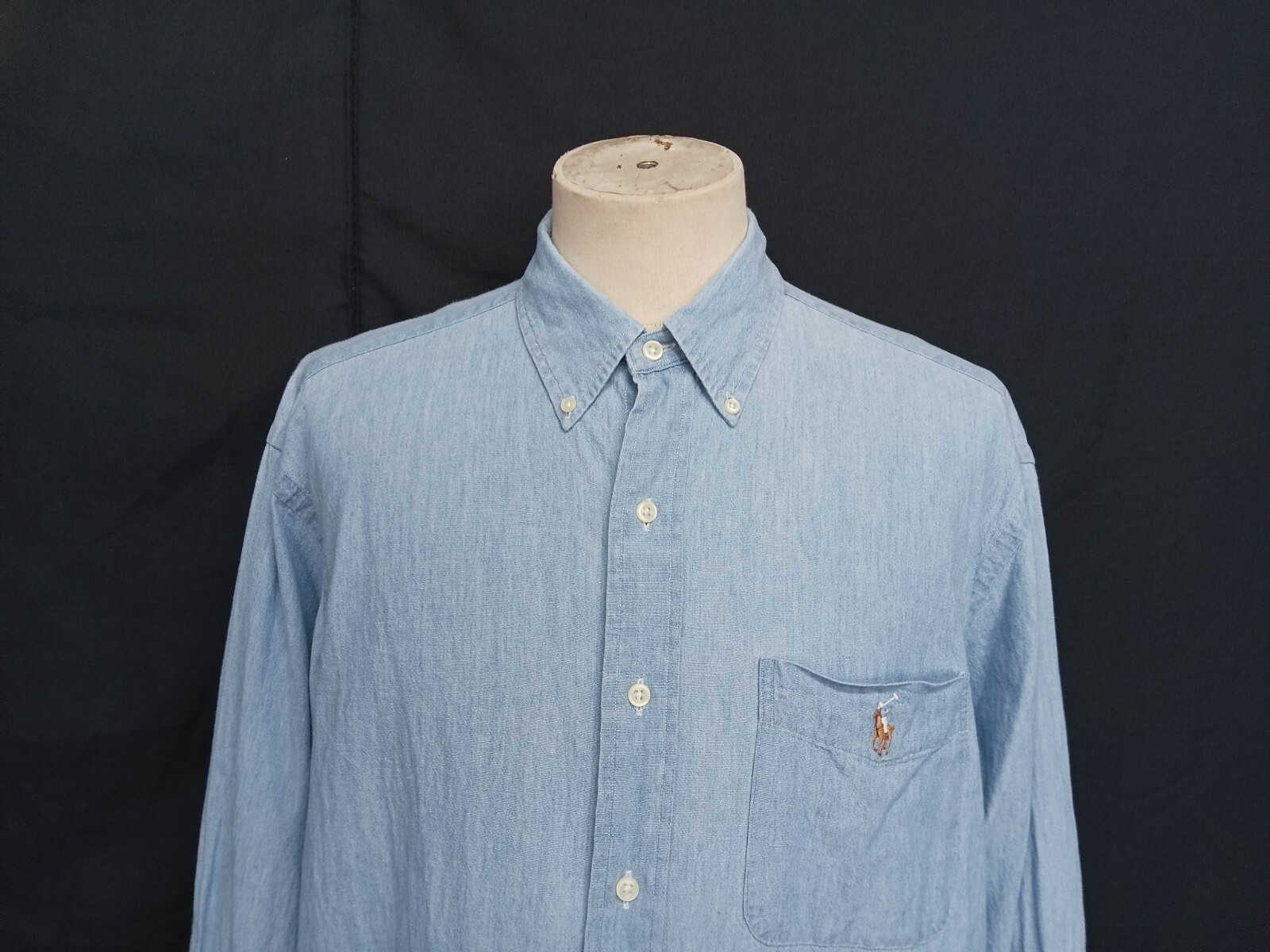 Awesome vintage 90's Ralph Lauren button-down chambray sky blue men's casual shirt long sleeves with buttons front classic fitted authenticity guaranteed. The shirt has button-down collar, single chest pocket with embroidered pony logo on left. 7 buttons closure on front. The color is sky blue with solid pattern. Fabric is 100% cotton chambray. The shirt is pre-owned still in excellent condition, there are no holes, tears, stains. It has been laundered clean and fresh ready to wear. Don't miss out cool and awesome shirt.