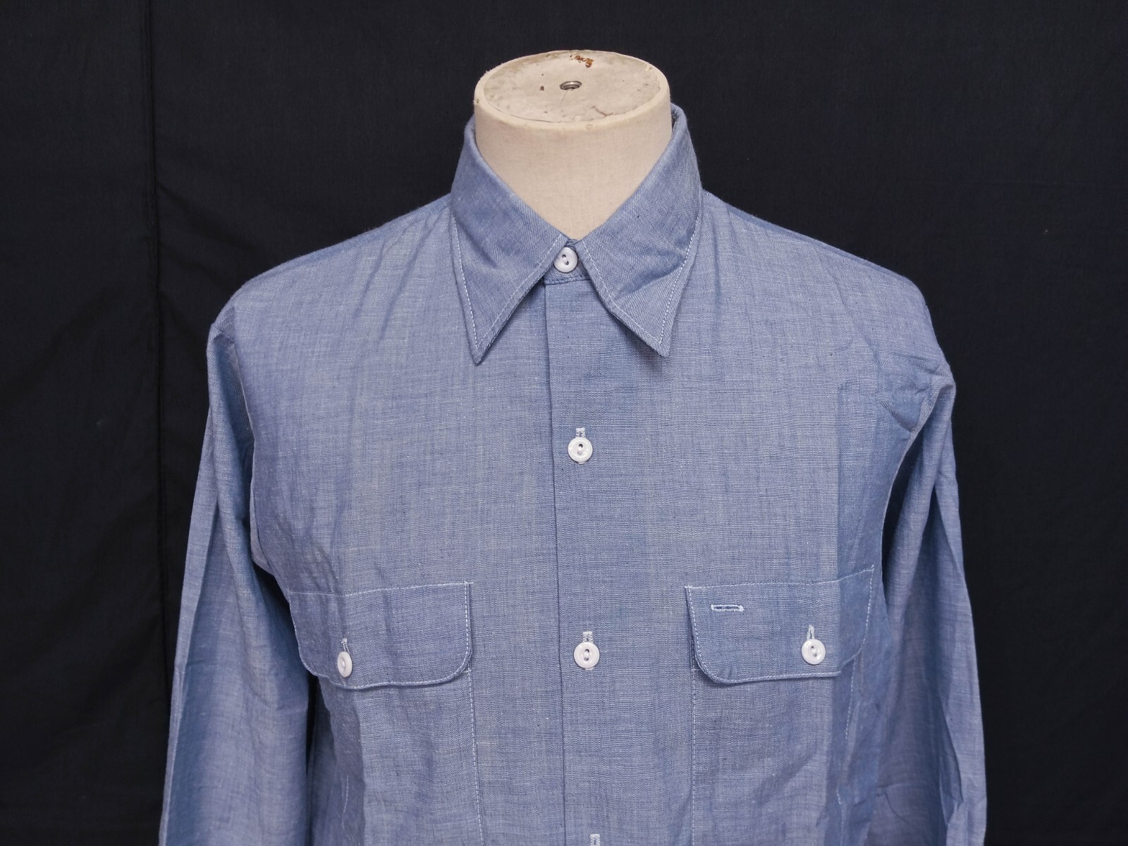 Cool vintage 70's BIG MAC by JCPenny selvedge chambray men's work shirt authenticity guaranteed. Check out awesome vintage shirt long sleeves with buttons front. The shirt has point collar, double chest button pocket with flap on front, 6 buttons closure on front. The color is sky blue with solid pattern. Fabric is chambray 50% cotton, 50% polyester, selvedge fabric. The shirt is new without tag still in good vintage condition no holes, tears, stains. It has been laundered clean and fresh ready to wear. Don't miss out cool and awesome vintage shirt.