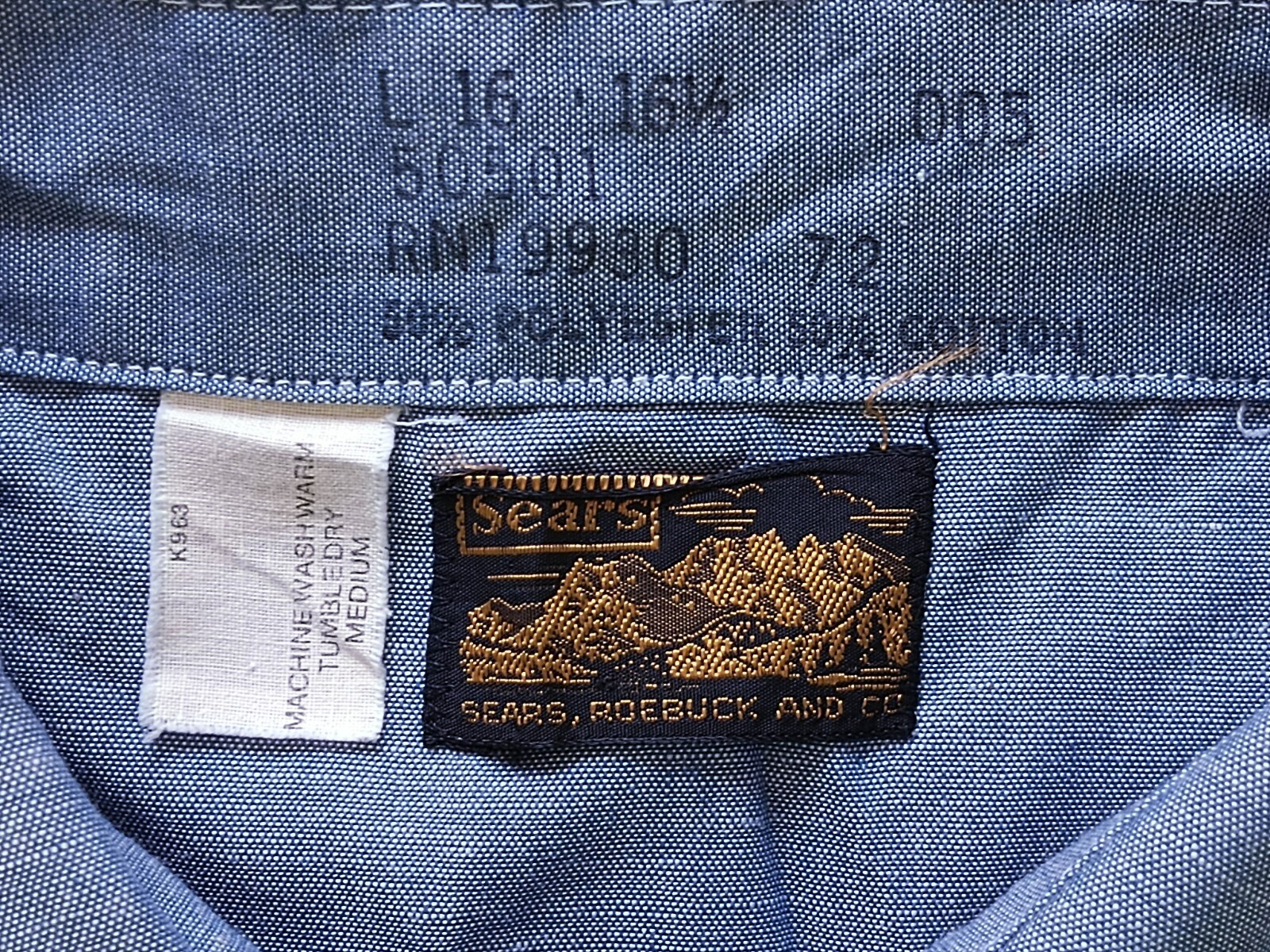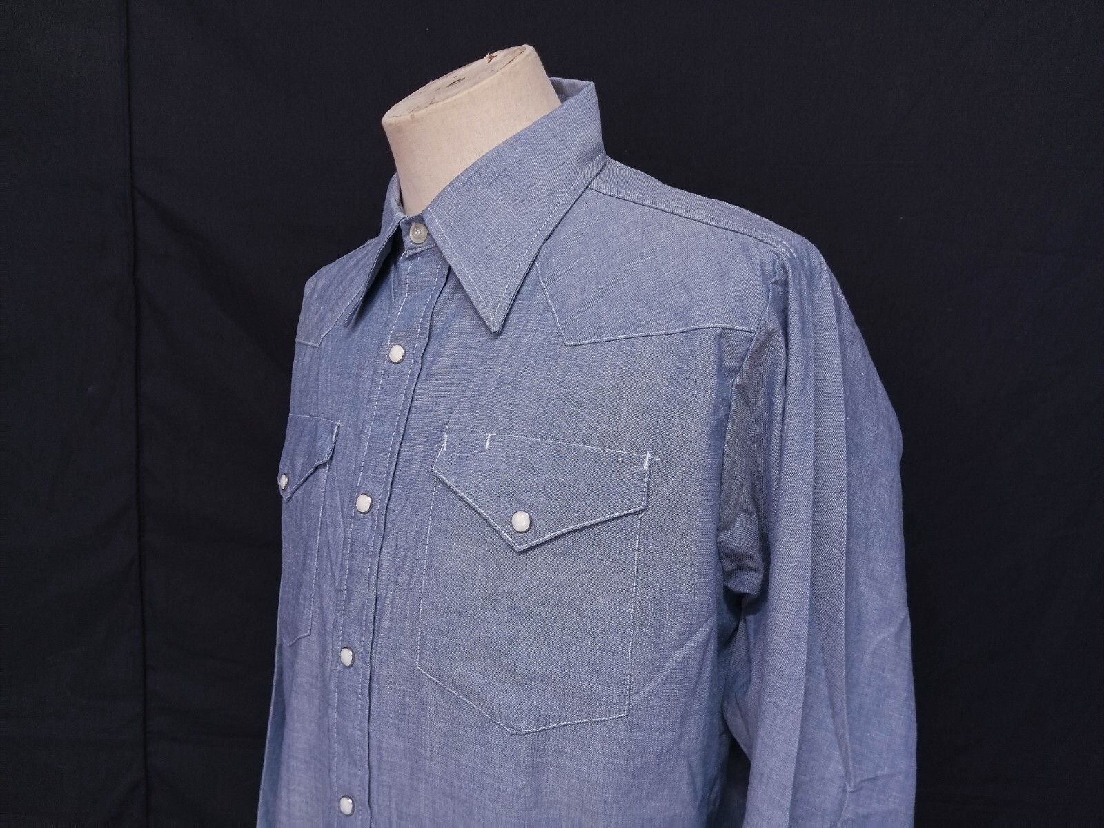 Rockabilly vintage 70's Sears Roebucks chambray sky blue men's western shirt long sleeves with snaps closure authenticity guaranteed. The shirt has point collar, double flap chest snap pockets with 7 stone snap buttons closure on front. The color is sky blue with solid pattern. Fabric is 50% cotton, 50% polyester chambray. The shirt is new without tag still in excellent vintage condition, nearly as new no holes, tears, stains. It has been laundered clean and fresh ready to wear. Don't miss out cool and awesome vintage western shirt.