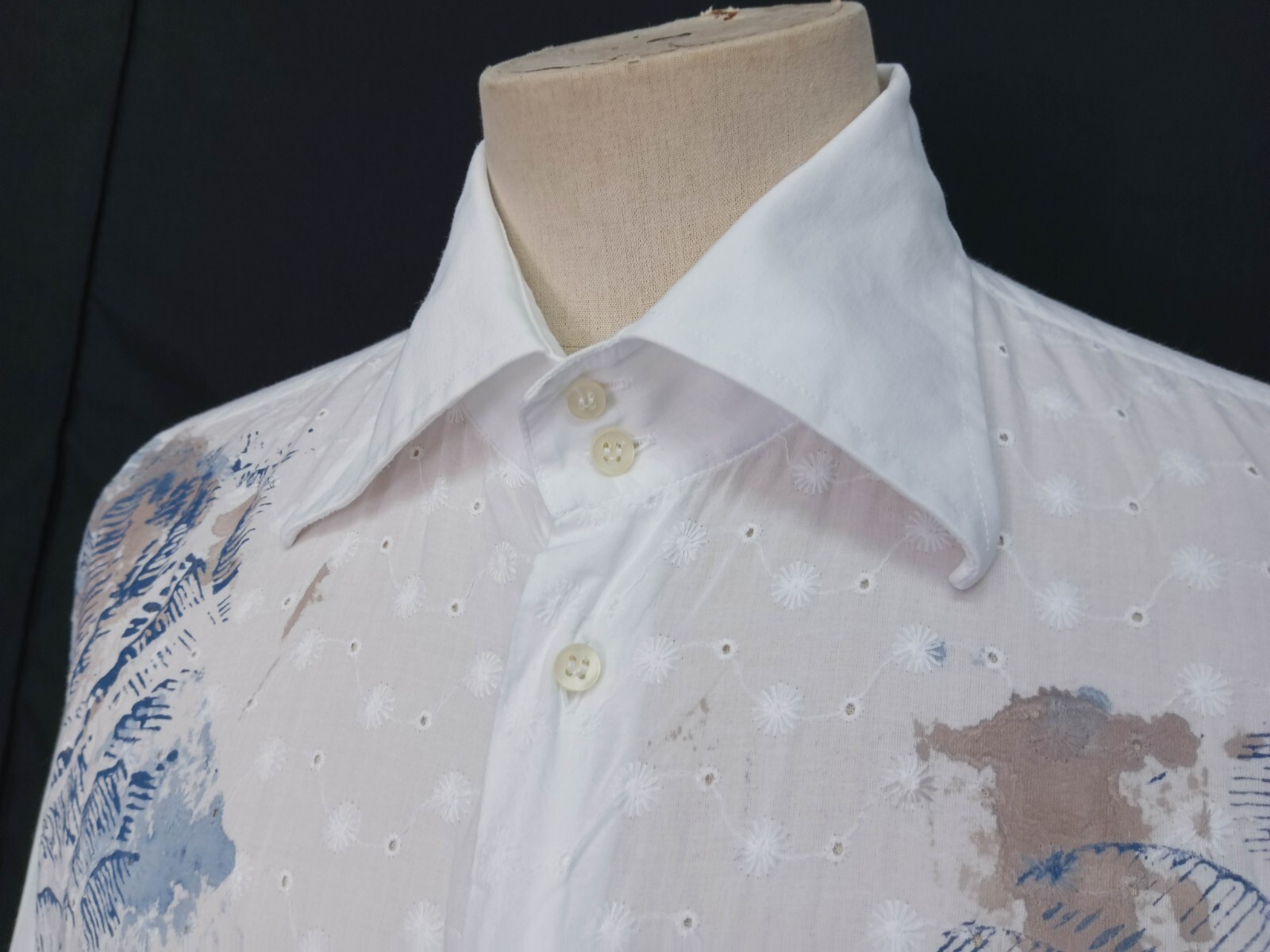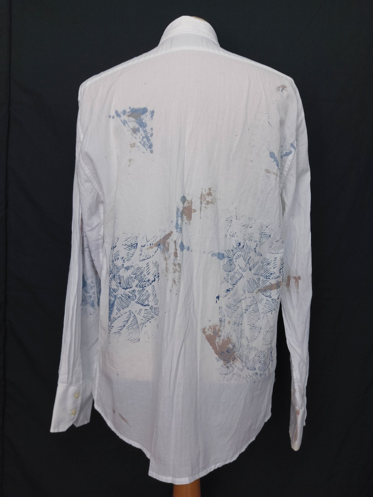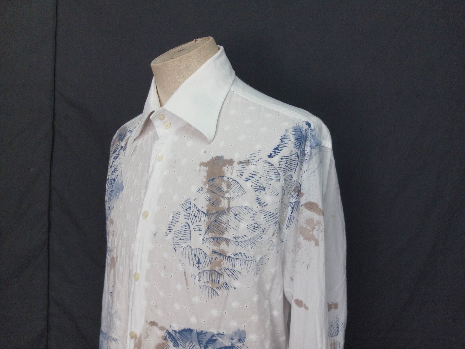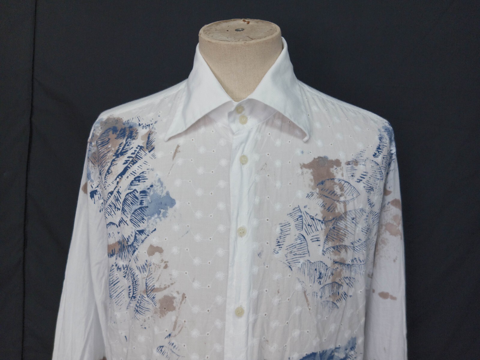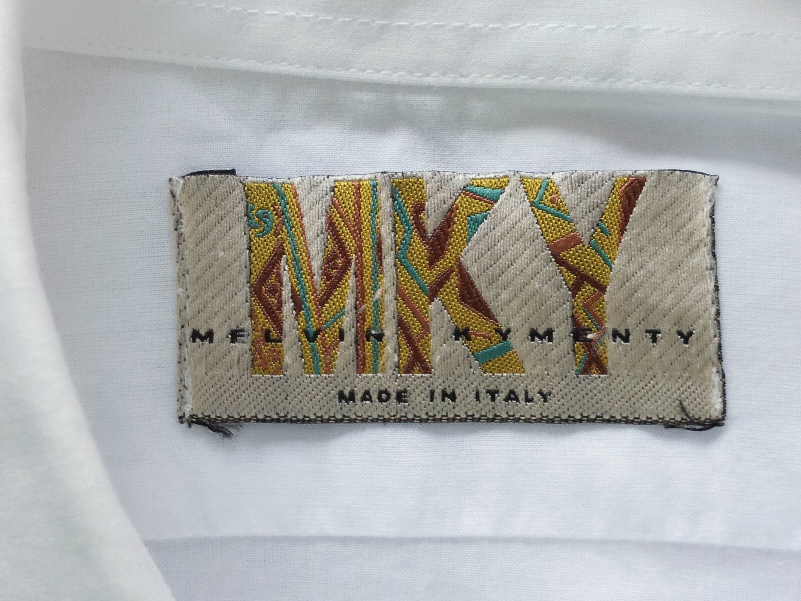 Awesome MIKY Melvin Kymenty white leaf woven men's casual shirt long sleeves with buttons front authenticity guaranteed. The shirt has spread collar, 7 buttons closure on front. The color is white, multicolor with leaf print and woven on front. Fabric look like 100% cotton. The shirt is pre-owned still in excellent condition, no holes, tears, stains. It has been laundered clean and fresh ready to wear. Don't miss out cool and awesome shirt.