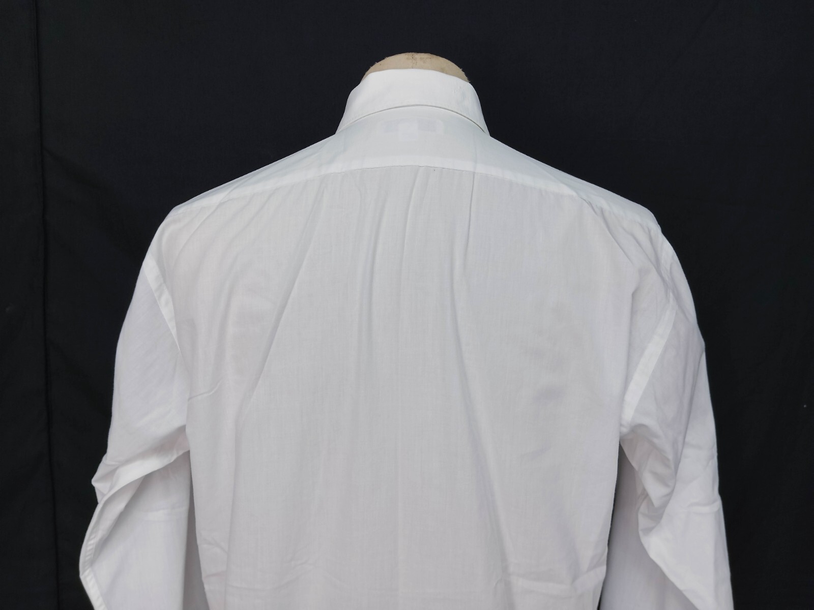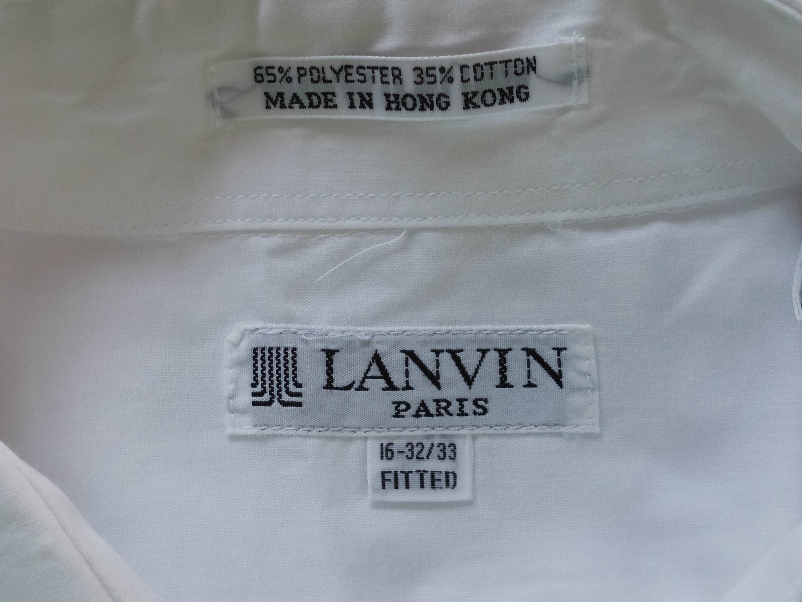 Luxury vintage Lanvin Paris solid white men's dress shirt long sleeves with buttons front authenticity guaranteed. The shirt has point collar, rounded cuff, single chest pocket on left with 6 buttons closure on front. The color is white with solid pattern. Fabric is 65% polyester, 35% cotton. The shirt is pre-owned still in good condition no holes, tears, stains. It has been laundered clean and fresh ready to wear. Don't miss out luxury designer shirt.