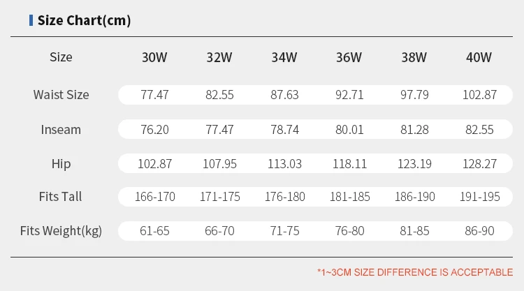 Size: 30W / 32W / 34W / 36W / 38W / 40W