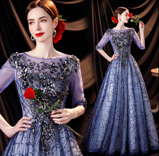 Elegant Blue Flowers Sequins Short Sleeve Tulle Prom Gown Party Evening Dresses