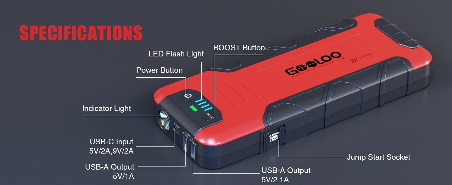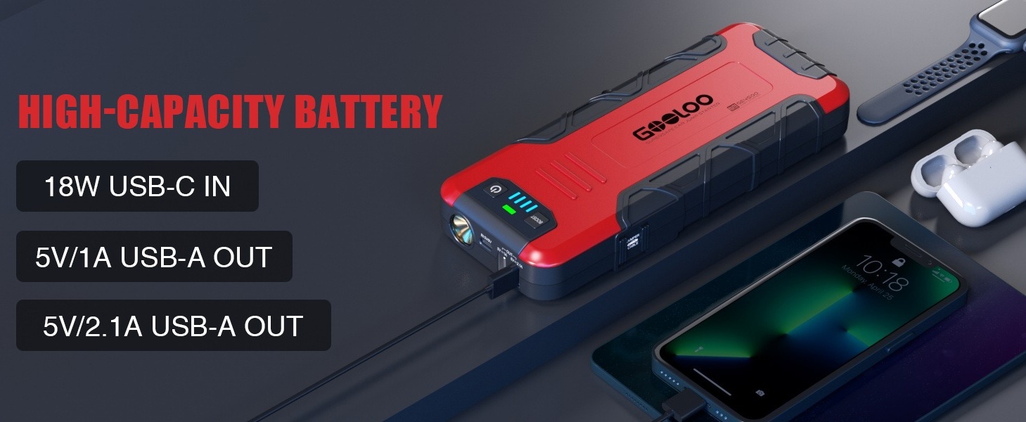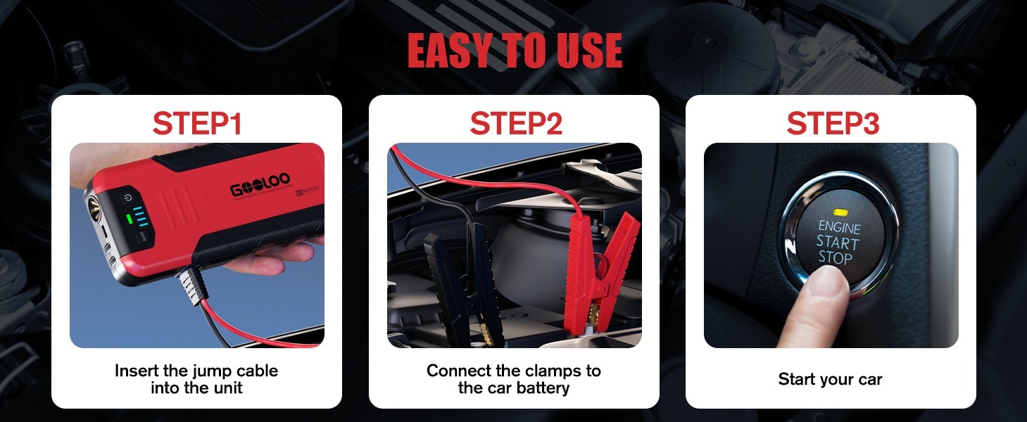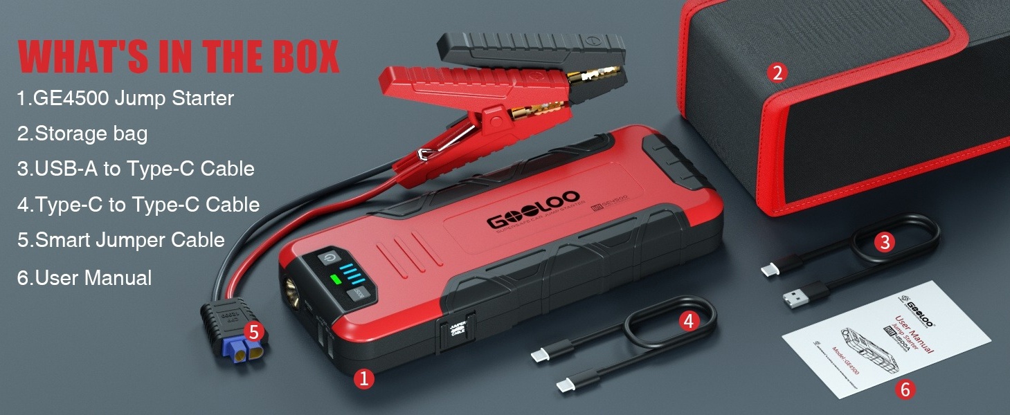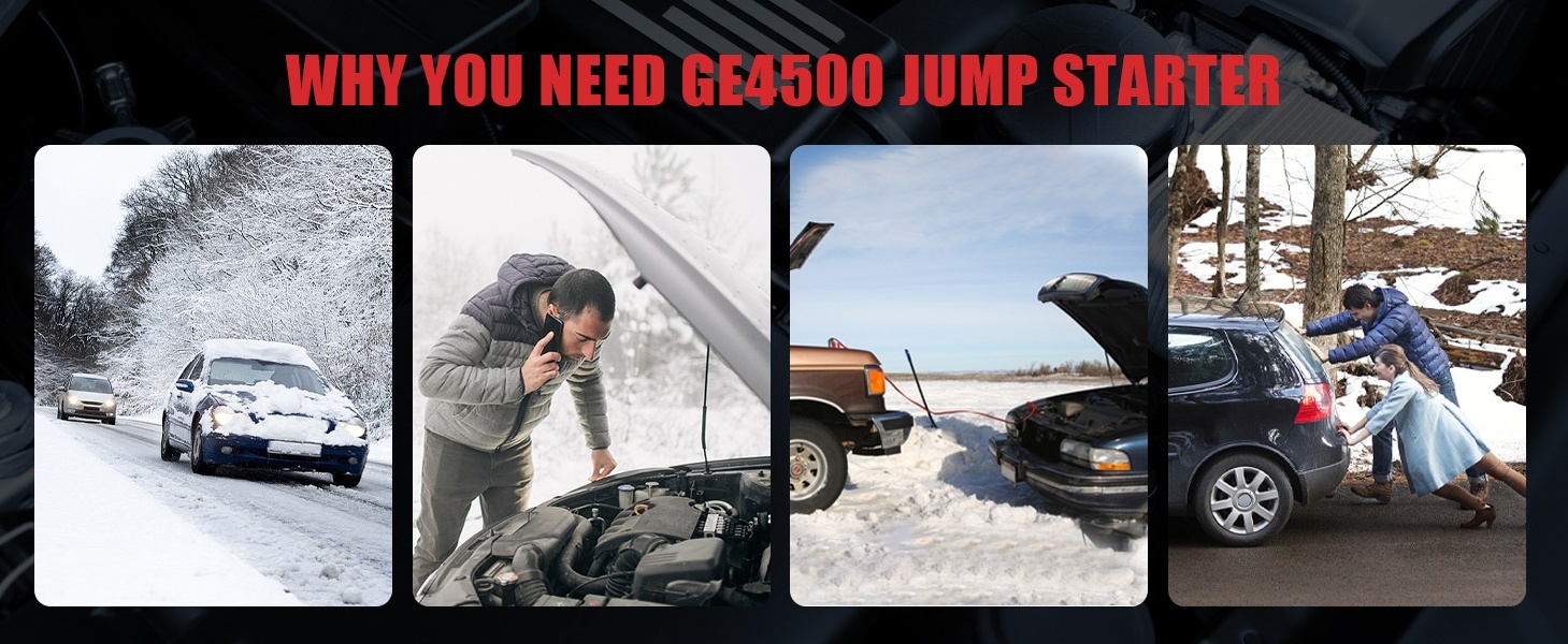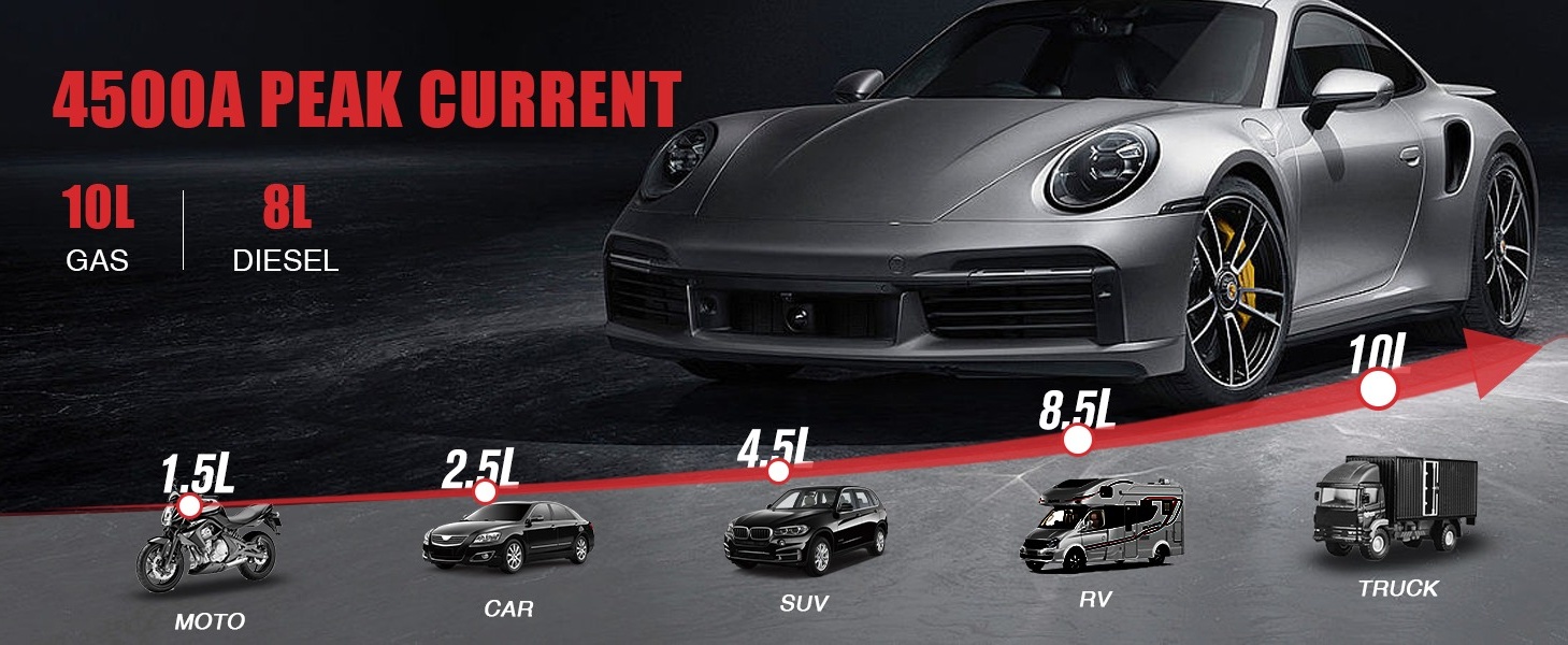 Powerful Performance: With 4500 Amps peak cranking power, the GE4500 jump starter can start almost all 12V vehicles, including up to 10L gasoline and 8L diesel engines.