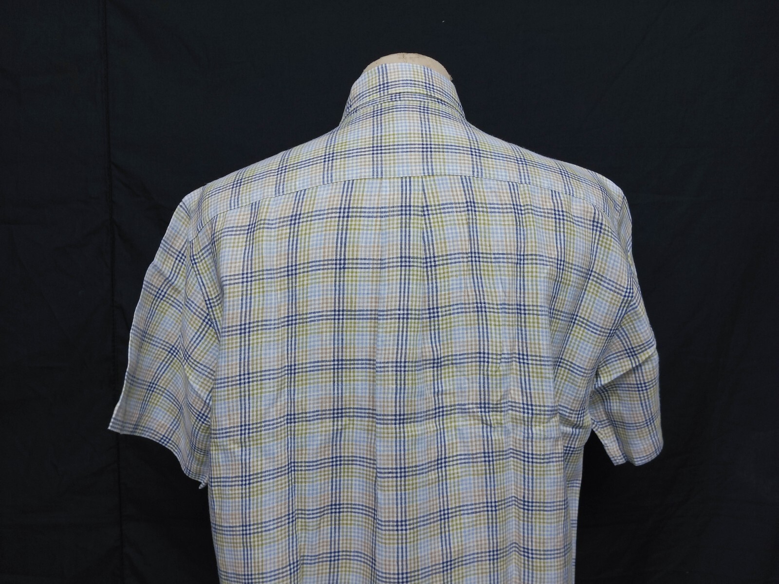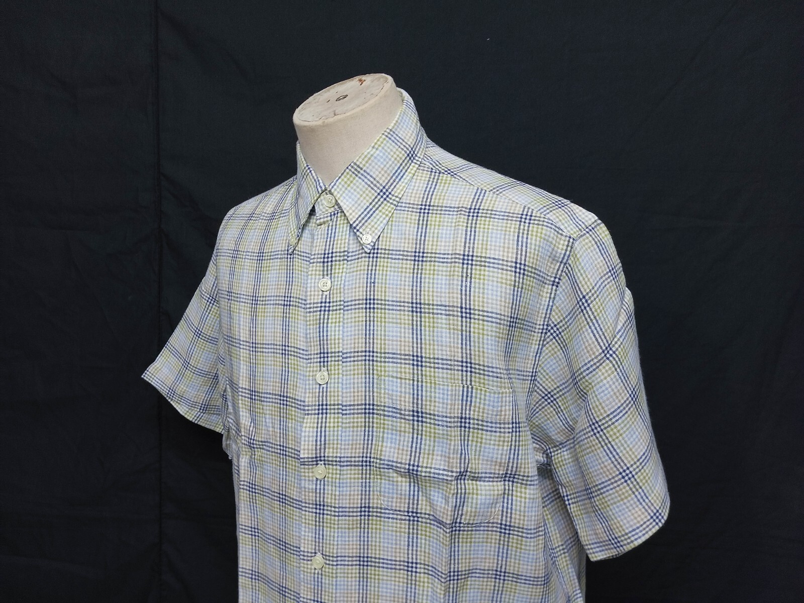 Awesome vintage Brooks Brothers multicolor plaid men's casual shirt authenticity guaranteed. Check out perfect shirt short sleeves with buttons front. The shirt has button-down collar, single chest pocket on left with 7 emboss buttons closure on front. The color is white, green, blue, cream with plaid pattern. Fabric is 100% linen. The shirt is pre-owned still in excellent condition nearly as new no holes, rips, stains. It has already laundered clean and fresh ready to wear. Don't miss out cool and awesome vintage shirt.