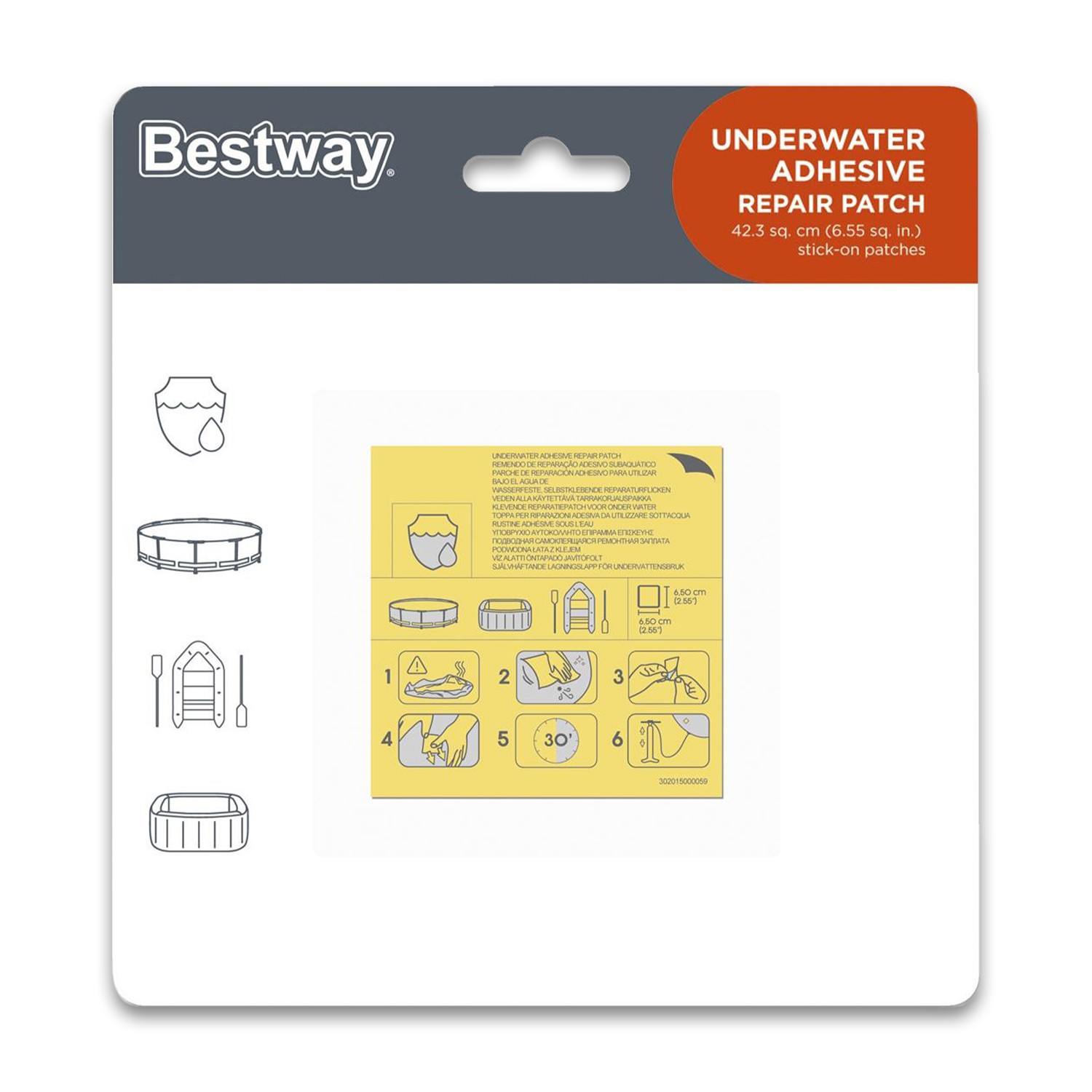 Mit den wasserfesten, selbstklebenden Reparaturflicken von Bestway® lassen sich kleine Löcher an Aufblasartikeln schnell und einfach verschließen.