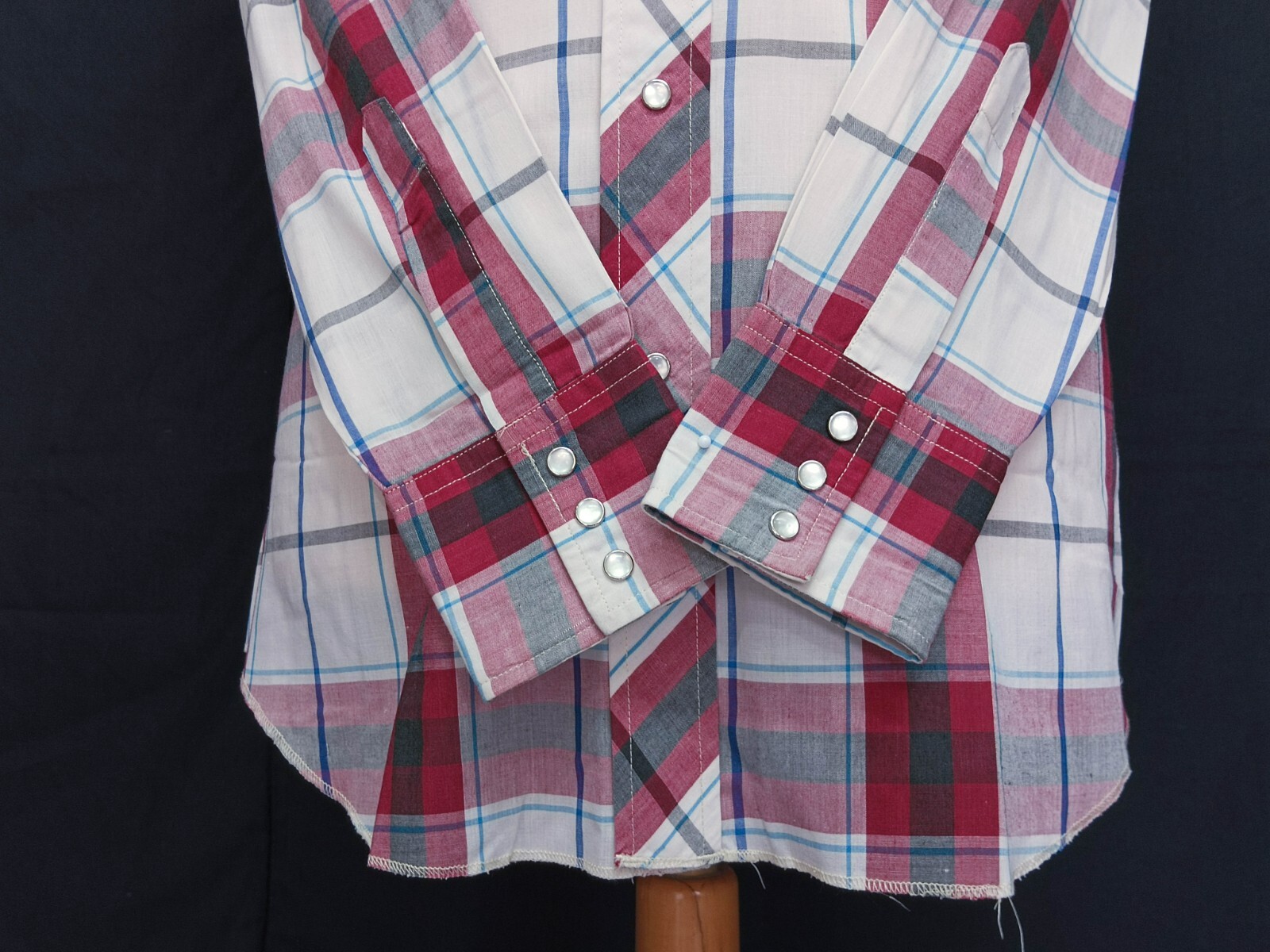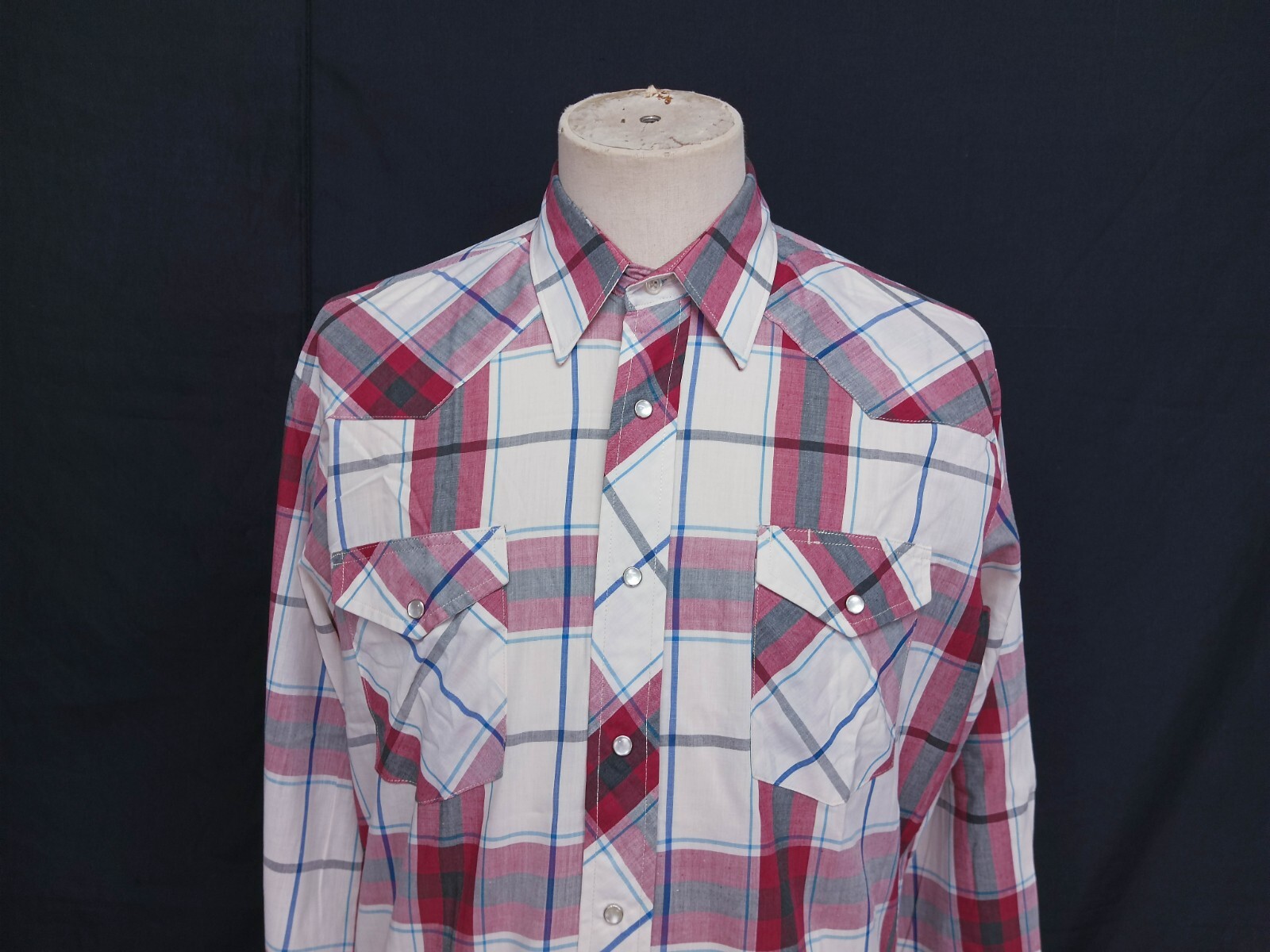 Awesome vintage 90's Wrangler pearl snap men's western shirt authenticity guaranteed. Check out awesome vintage shirt long sleeves with snaps closure. The shirt has point collar, double flap chest snap pockets with 7 pearl snap buttons closure on front. The color is multicolor with plaid pattern. Fabric is 65% polyester, 35% cotton. The shirt is pre-owned in good vintage condition, tiny scratch on collar of the shirt. Please see the photos. It has been laundered clean and fresh ready to wear. Don't miss out cool and awesome vintage western shirt.
