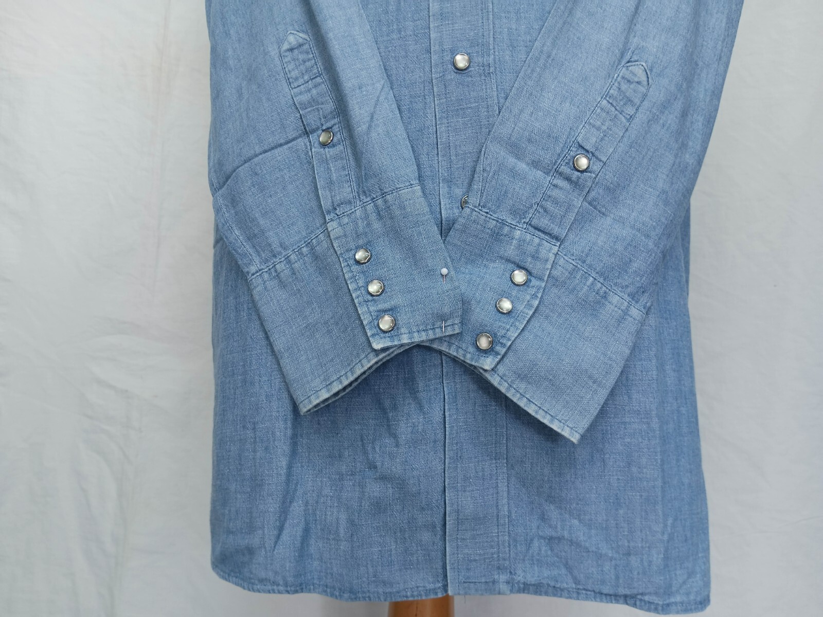 Awesome vintage Karman Gold Collection chambray pearl snap men's western shirt authenticity guaranteed. Check out cool vintage shirt long sleeves with snaps closure. The shirt has point collar, double chest snap pockets with 8 pearl snap buttons closure on front. The color is sky blue with solid pattern. Fabric is 100% cotton chambray. The shirt is pre-owned still in good vintage condition, stain at hem of the shirt. Please see the photos. It has already laundered clean and fresh ready to wear. Don't miss out cool and awesome vintage shirt.