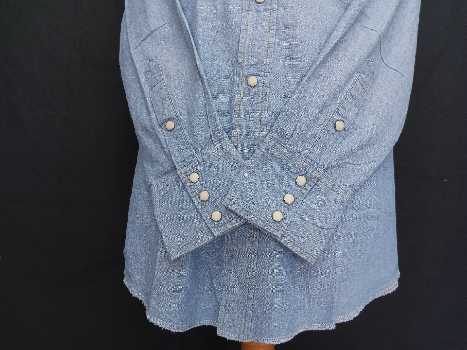 Awesome vintage 90's Wrangler chambray pearl snap men's western shirt authenticity guaranteed. Check out awesome vintage shirt long sleeves with buttons front. The shirt has point collar, double flap chest snap pockets with 7 mother of pearl snap buttons closure on front. The color is sky blue with solid pattern. Fabric is 100% cotton. The shirt is pre-owned in good vintage condition no holes, rips, stains. It has been laundered clean and fresh ready to wear. Don't miss out cool and awesome vintage western shirt.